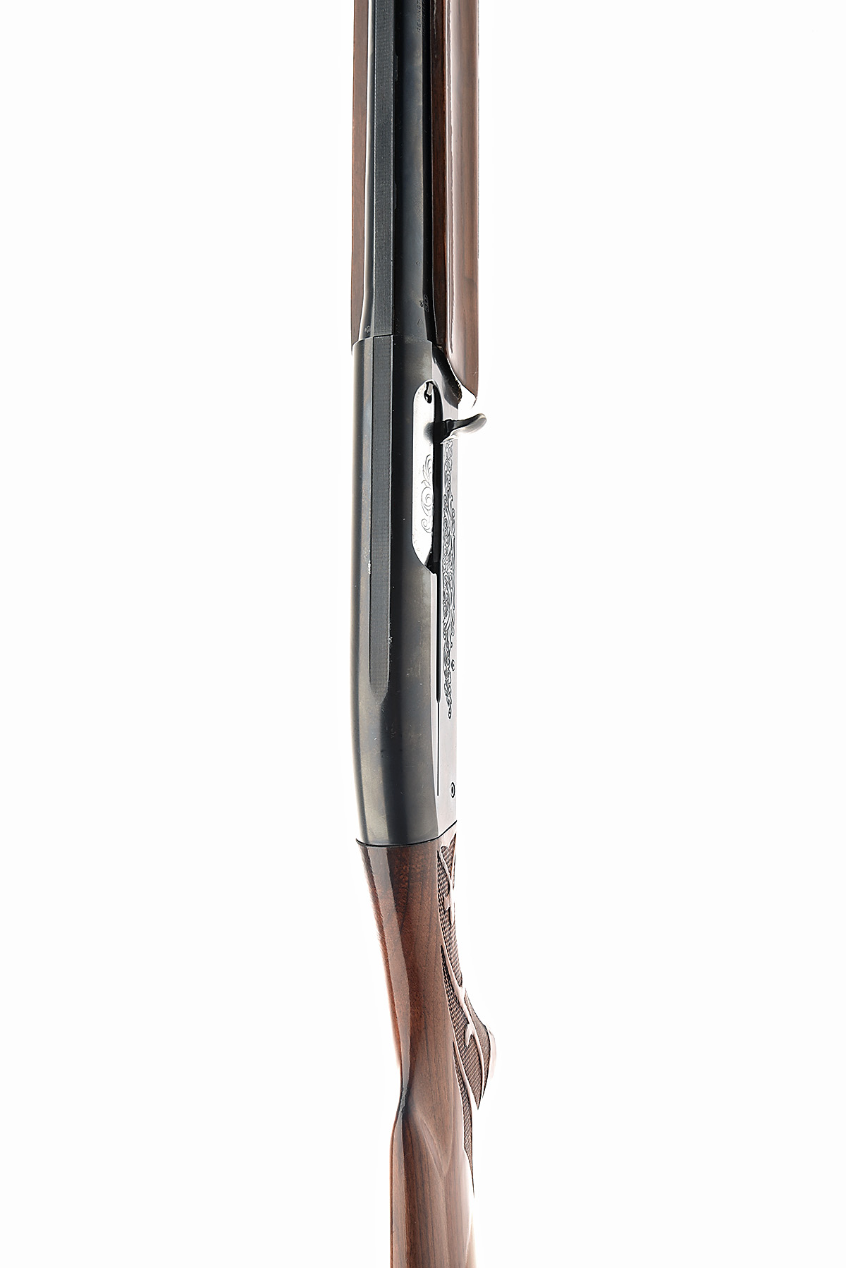 AN F.A.C. REMINGTON 12-BORE 'MODEL 1100' SEMI-AUTO SHOTGUN, serial no. N434955V, circa 1980, 28in. nitro reproved (in 2023) barrel with 8mm ventilated barrel, 2 3/4in. chamber, bored approx. 3/4 choke, manual push-button safety, blacked action with partial acanthus scroll engraving, 14 1/8in. ornately chequered pistolgrip stock including buttplate