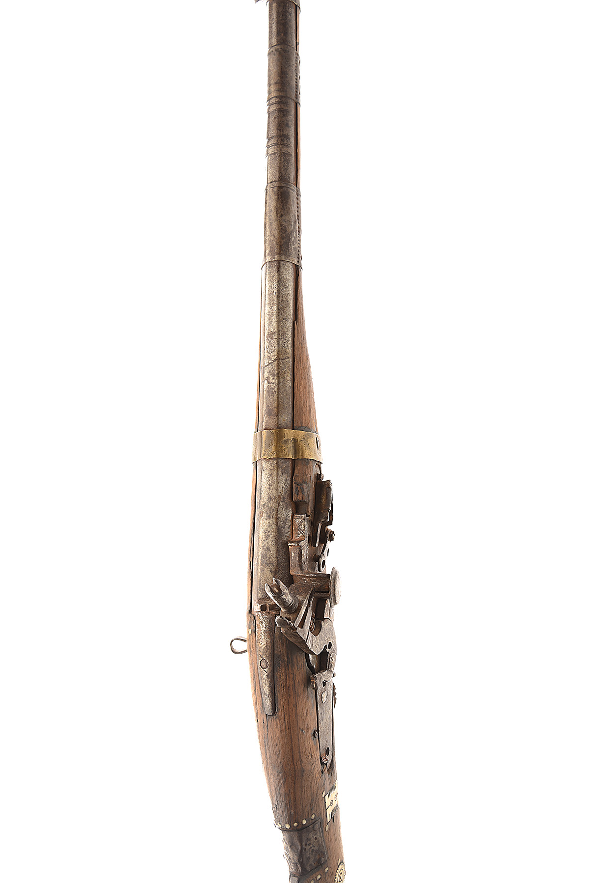 46in, two stage barrel with flared muzzle, bead front-sight and fixed vee rear-sight, miquelet style lock, full wooden stock with inlaid bone decoration and fish-tail butt, the barrel secured by fourteen wrapped and decorated metal bands.