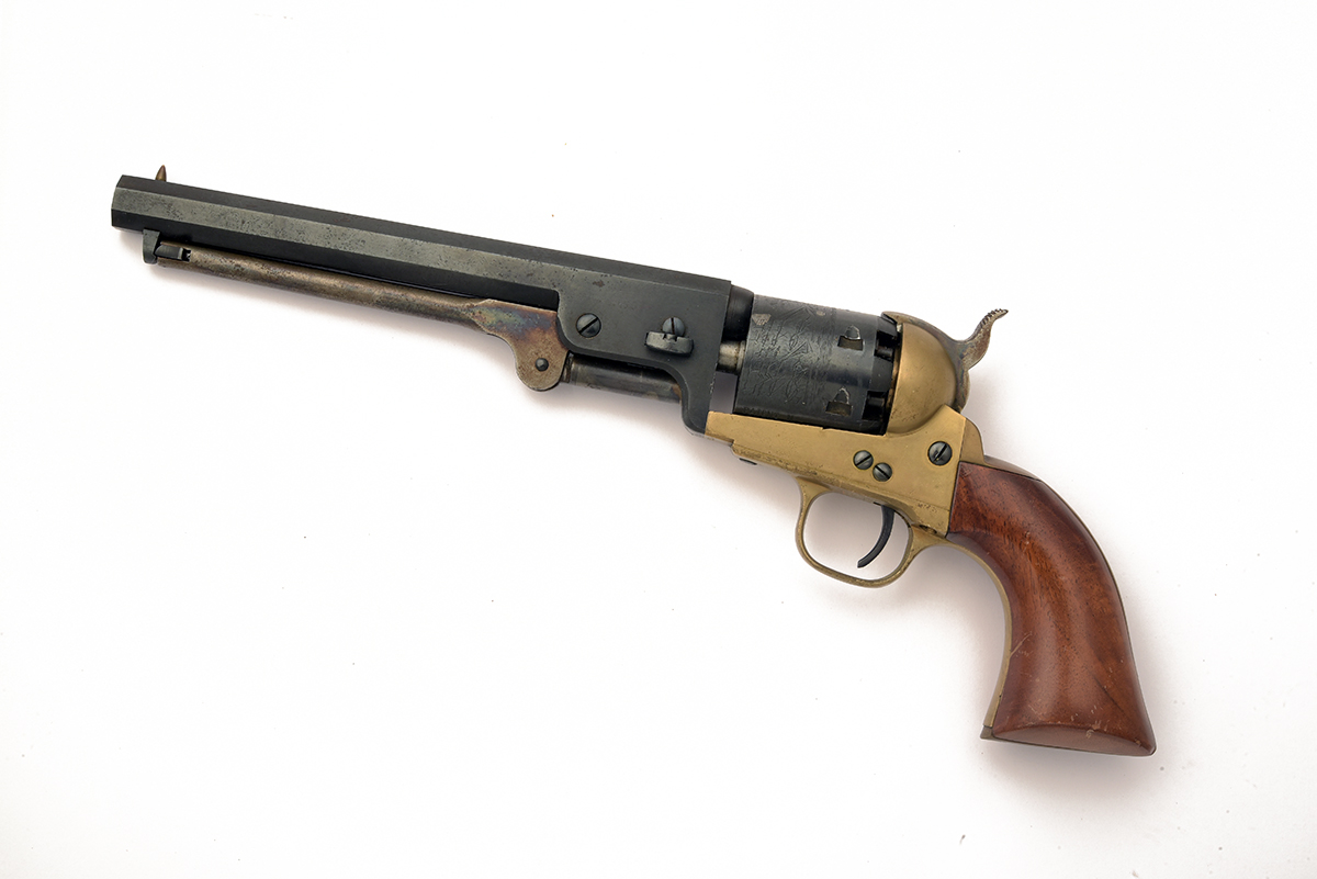 A NON-FIRING/INERT .36 MODEL 1851 COLT NAVY REVOLVER, UNSIGNED, serial number 55224, circa 1970s reproduction with blued steel 7 1/2 in. octagonal barrel, open brass frame, 6-shot cylinder roll-engraved with naval scene, wooden grips, brass straps and trigger-guard, steel rammer, 13 1/2 in. overall