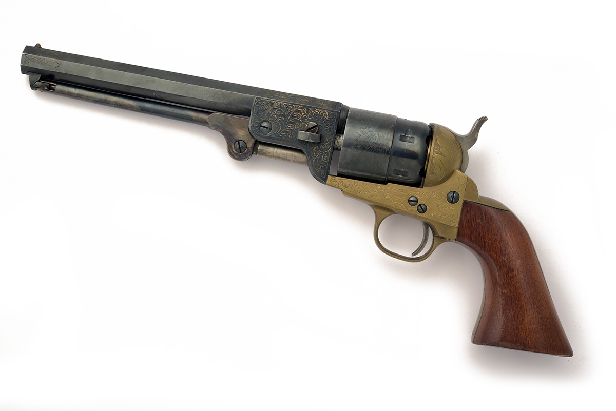 A NON-FIRING/INERT .36 MODEL 1851 COLT NAVY, UNSIGNED, no visible serial number, circa 1970s reproduction with 7 1/4 in. blued steel octagonal barrel with gold inlaid engraving, open brass engraved frame, grip-straps and trigger-guard, 6-shot blued steel cylinder with engraved naval scene, varnished wooden grips, steel hammer, trigger and rammer, 13 3/4 in. overall