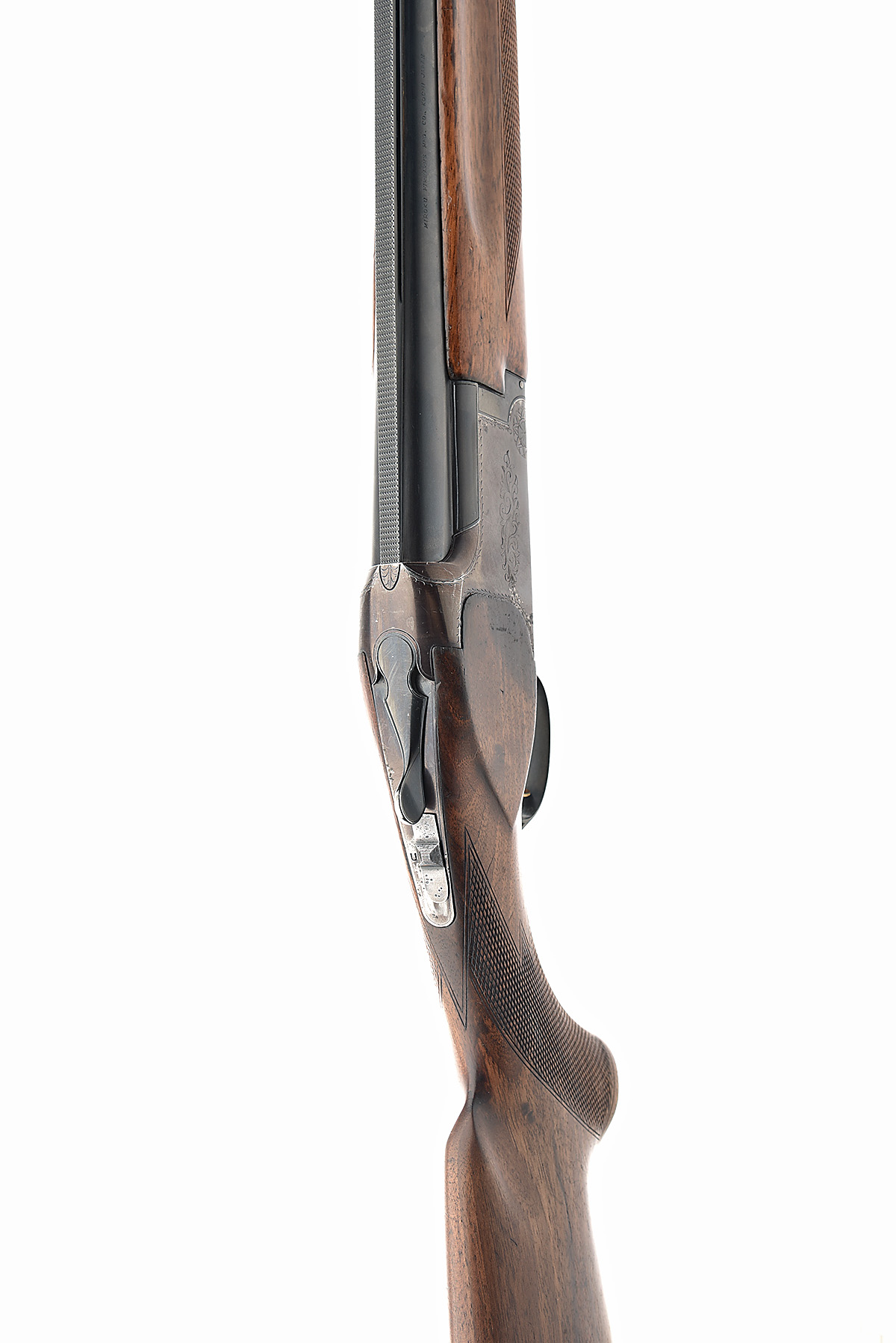 MIROKU FIREARMS MFG. CO. 12-BORE SINGLE-TRIGGER OVER AND UNDER EJECTOR, serial no. 378955, circa 1974, 30in. nitro barrels (pitted, rib loose) with 8mm ventilated matt top-rib, 2 3/4in. chambers, bored approx. 1/2 and 1/4 choke, hold-open toplever, manual safety with integral barrel selector switch, gold-washed single trigger, border and partial scroll engraving, 14 1/2in. pistolgrip stock including 1in. ventilated rubber recoil pad, weight 7lb. 11oz.