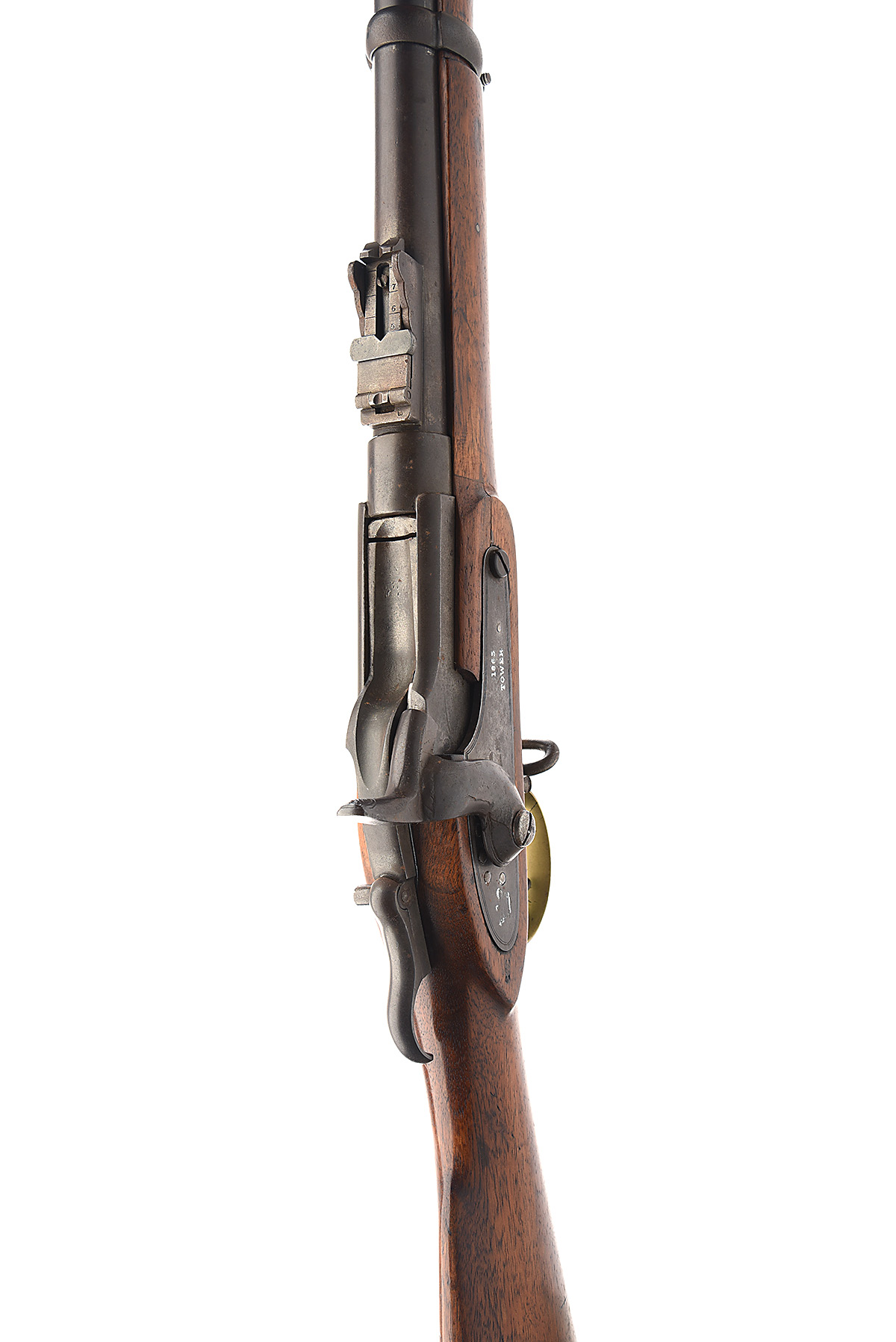A .58 RIMFIRE ROBERTS PATENT BREECH LOADING RIFLE SIGNED TOWER AND DATED 1863, serial number 4846 made by the Providence Tool Company of Providence Rhode Island, with 30 3/4in. barrel rifled with three grooves, fitted with a block and blade front-sight, and Enfield pattern ladder rear-sight, the barrel is also fitted with a bayonet lug near the muzzle, numbered "184" the action stamped "ROBERTS PAT / JUNE 11 1867", the borderline engraved lock of Enfield style stamped with a crown on the tail and "1863 / TOWER" to the centre, the action featured a tilting block similar to the Martini but operated by a top lever, regulation brass mounted full walnut stock, two iron barrel bands, complete with original rod. This system was invented by U.S. General Benjamin Roberts as a means to convert surplus Civil War rifle muskets into breech loaders, this example being converted from a P53. The system was not a success but France purchased a quantity during the Franco-Prussian war.