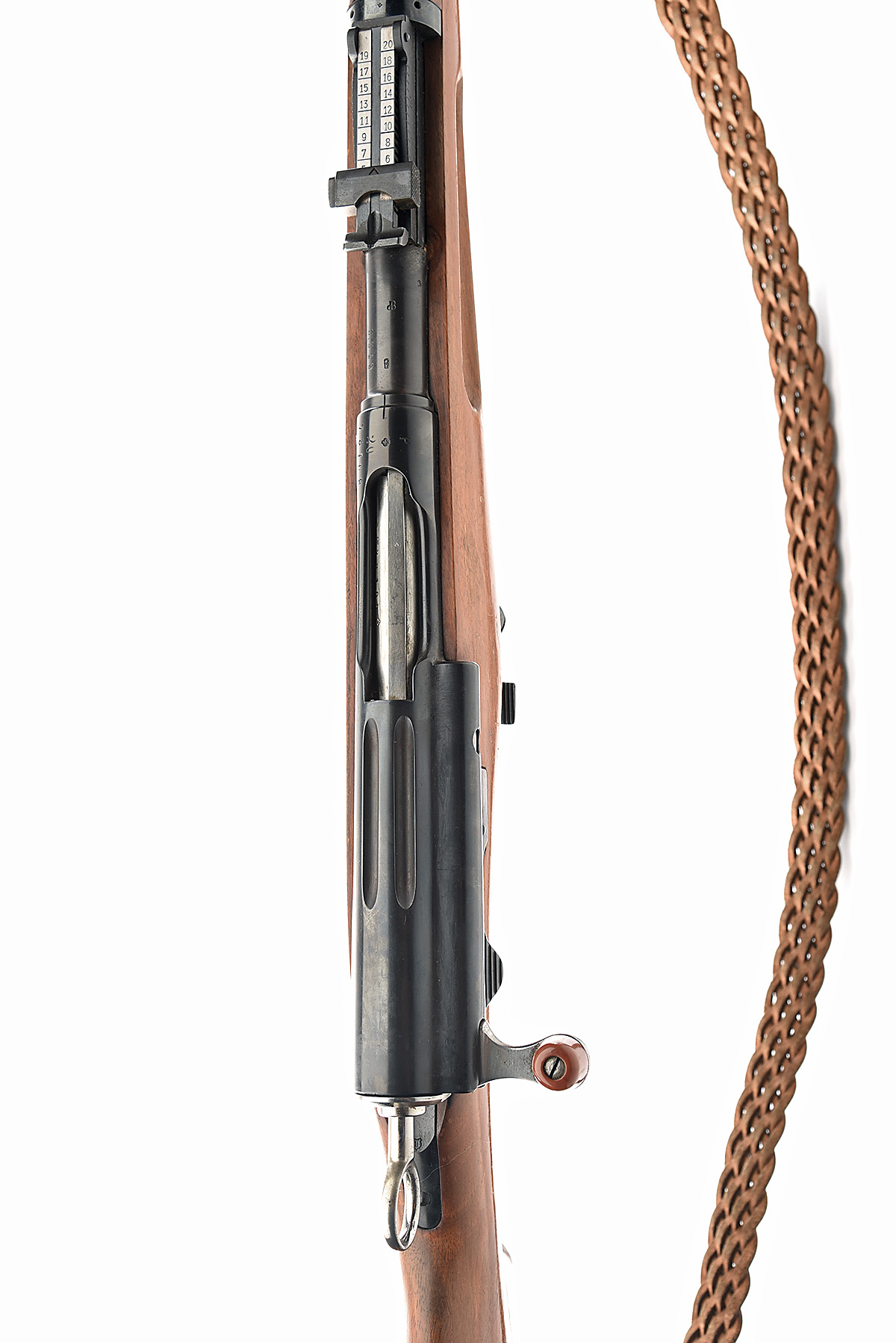 for 1892, 30 1/2in. nitro reproved (in 2022) barrel, numbered 3319, dove-tailed blade fore-sight, tangent rear-sight, manual ring safety, fluted action retaining much blued finish, full-length walnut stock, two barrel bands, 12in. pull including steel buttplate, leather sling, weight 10lb. 9oz.