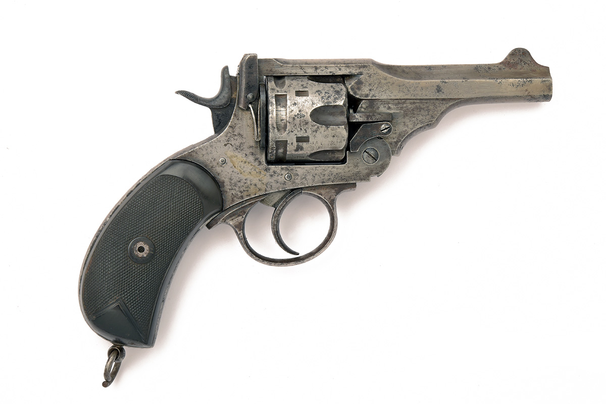 A .455 SIX-SHOT REVOLVER SIGNED WEBLEY, MODEL 'MKV',serial no.145242, dated for 1915, with 4in. barrel, fluted cylinder, break-open frame and chequered hard rubber grips, finish worn, some shallow pitting, complete with a leather holster