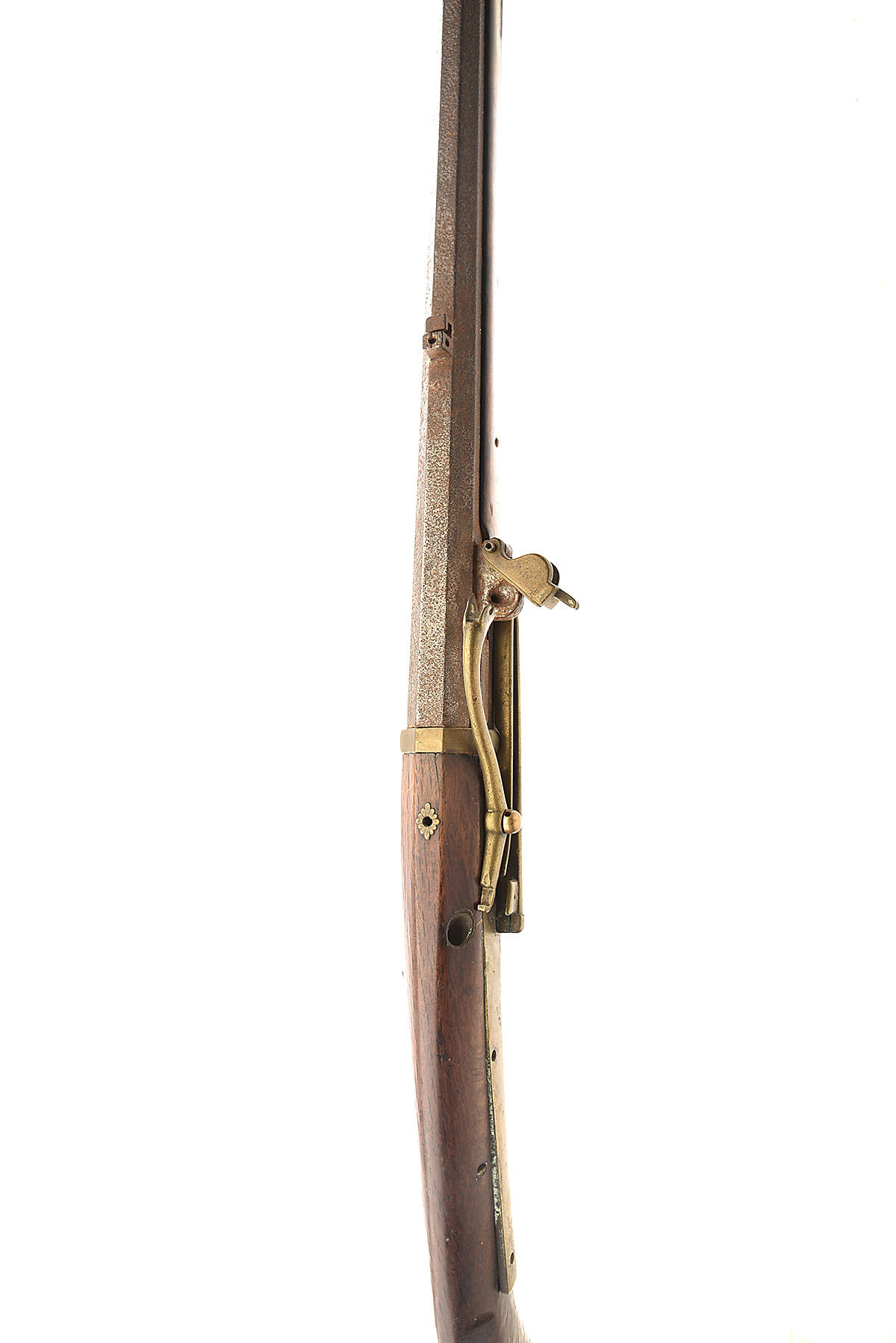 A 28-BORE MATCHLOCK MUSKET, UNSIGNED, MODEL 'JAPANESE TANEGASHIMA', no visible serial number, late Edo period with octagonal 41 3/4in. iron barrel, block fore-sight, rear-sight block, brass barrel retaining band at breech, swinging brass pan-cover, plain elongated brass lockplate with large external brass mainspring (missing some screws), hand-cocked serpentine match-holder, wooded full-stock of classic form with isolated brass decoration and floral escutcheoned match apertures, ball trigger missing guard, further brass muzzle-band to the middle, possible replacement under-barrel ramrod