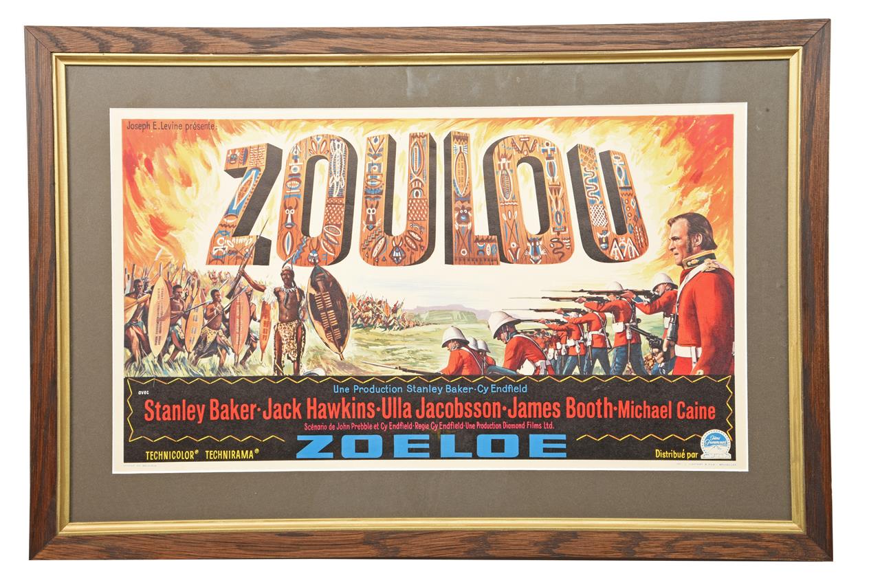 A BELGIAN FRAMED CINEMA POSTER FOR THE 1964 FILM 'ZOULOU' [ZULU], french language, printed in Brussels, poster 12 in, X 21 in., professionally framed in dark wood with gold border, frame 17 1/2 in. X 26 in.