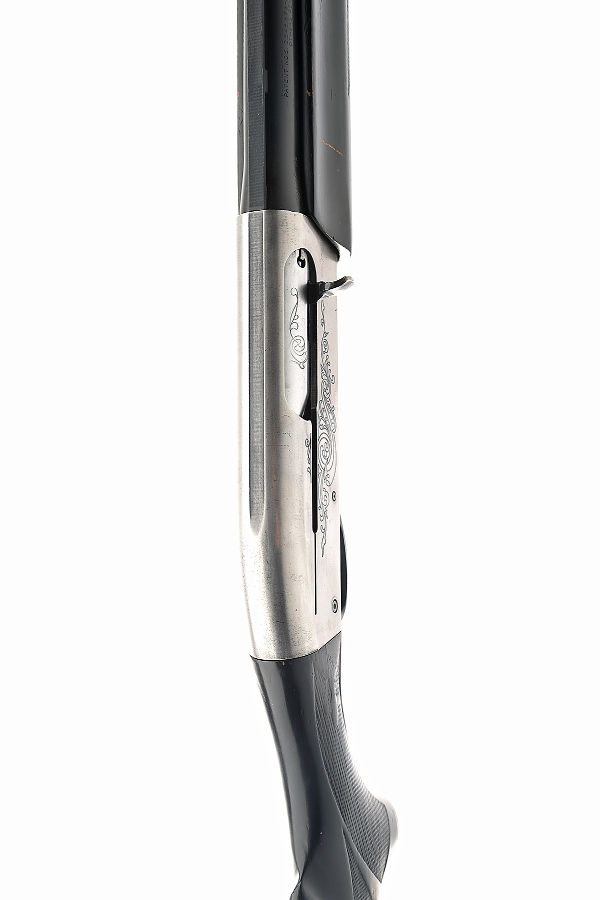 REMINGTON 12-BORE 'MODEL 1100' SEMI-AUTO SHOTGUN, serial no. 348532V, circa 1967, restricted magazine, 28in. nitro reproved (in 2023) barrel with 7mm ventilated matt rib, 2 3/4in. chamber, bored approx. full choke, manual push-button safety, blacked action with partial acanthus scroll engraving, 14in. pistolgrip stock including buttplate, brushed bright and blacked finish