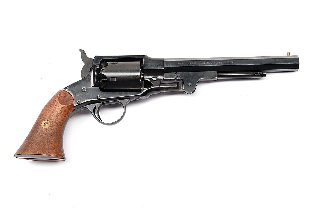 A BOXED REPRODUCTION .44 PERCUSSION REVOLVER SIGNED EUROARMS, MODEL 'ROGERS & SPENCER' serial no. 24599, with blued octagonal 7 1/2in. barrel, solid frame, plain cylinder and smooth walnut grips, appearing unused in its maker's card and polystyrene carton