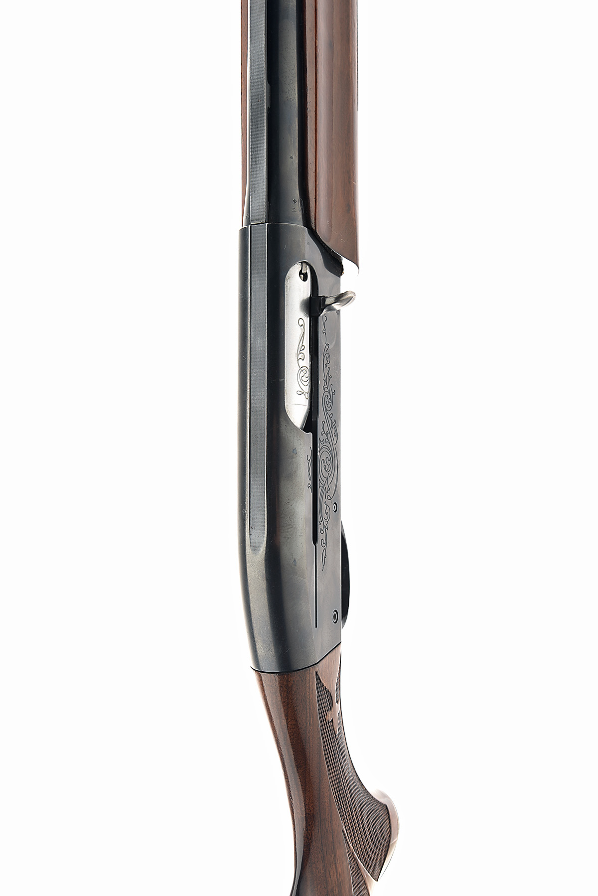 REMINGTON 12-BORE 'MODEL 1100' SEMI-AUTO SHOTGUN, serial no. M298384V, circa 1976, restricted magazine, 28in. nitro reproved (in 2023) barrel with 8mm ventilated matt rib, 2 3/4in. chamber, bored approx. 1/2 choke, manual push-button safety, blacked action with partial acanthus scroll engraving, 14in. ornately chequered pistolgrip stock including buttplate