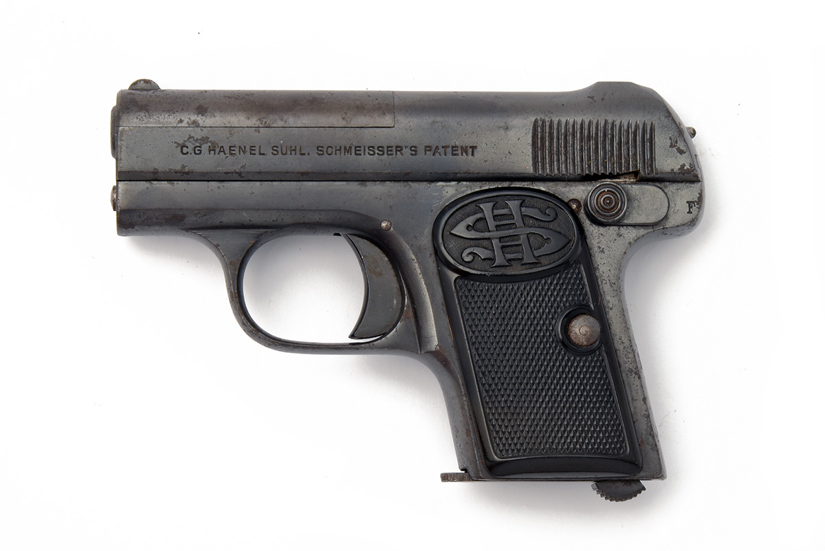 A 6.35mm (.25 ACP) HAENEL SEMI-AUTOMATIC POCKET-PISTOL, MODEL 'SCHMEISSER'S PATENT MODEL I', serial no. 41558, circa 1925, with concealed 2in. barrel, blued fully enclosed slide, blued frame and chequered hard rubber grips