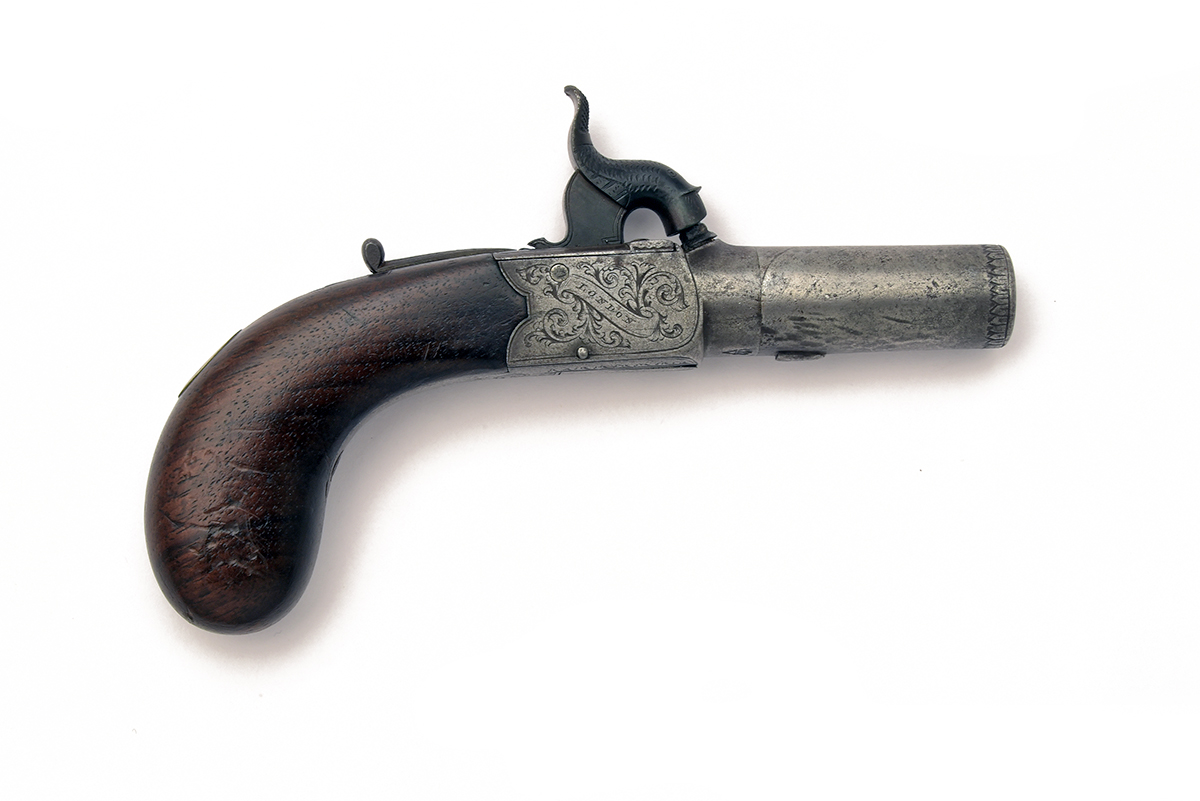 A 54-BORE PERCUSSION BOX-LOCK MUFF PISTOL SIGNED ANDREWS, no visible serial number, circa 1810 flintlock converted to percussion, with 1 3/4 in. turn-off steel barrel, scroll-engraved box-lock with engraved tangs, marked 'ANDREWS' to one side and 'LONDON' opposite, blued dolphin hammer, sliding safety, wooden bag-shaped butt with unengraved oval white metal escutcheon, drop-down trigger, some cleaned light pitting, minor knocks to the butt, closed split behind lock on left side of butt, 6 in. overall