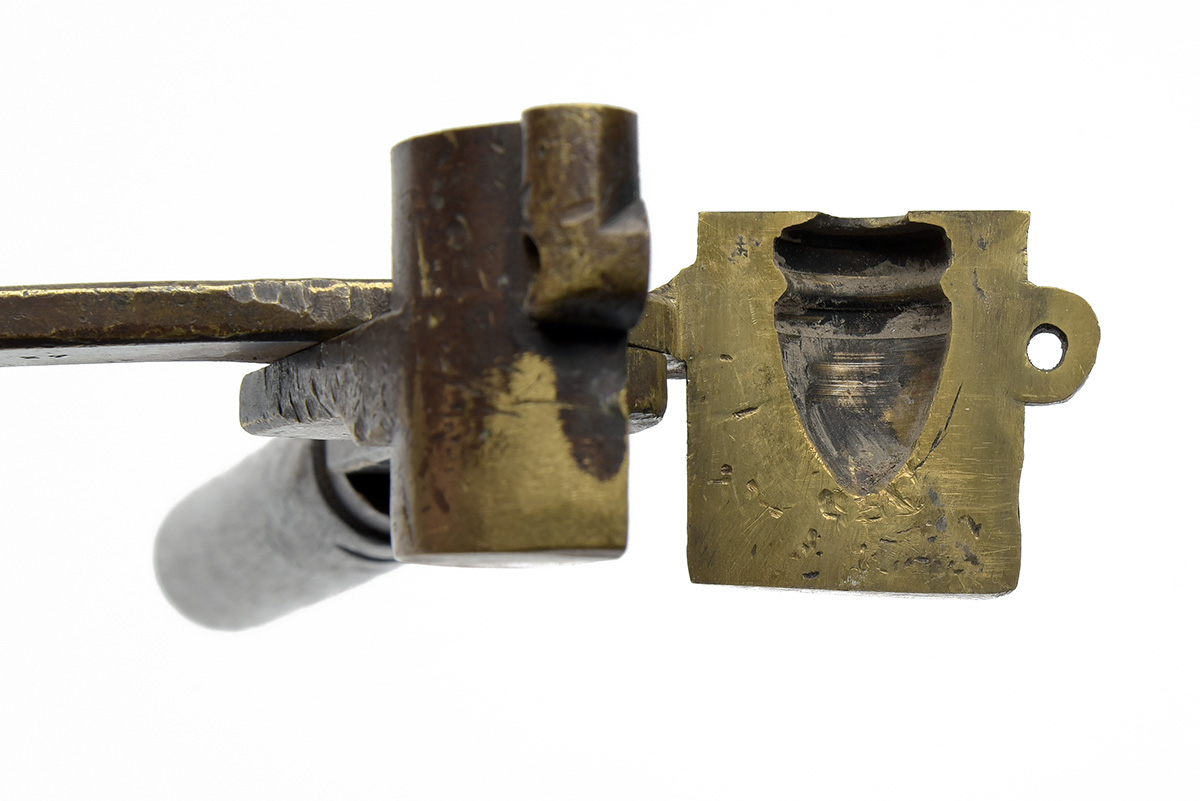 A PAIR OF BULLET-MOULDS, 1) brass, stamped '577' and numbered '7942', rusting and pitting to the sprue-cutter, 10 1/4 in.; 2) brass with wooden handles, stamped '27' and 'CHAS INGRAM', missing sprue-cutter, 9 1/4 in.