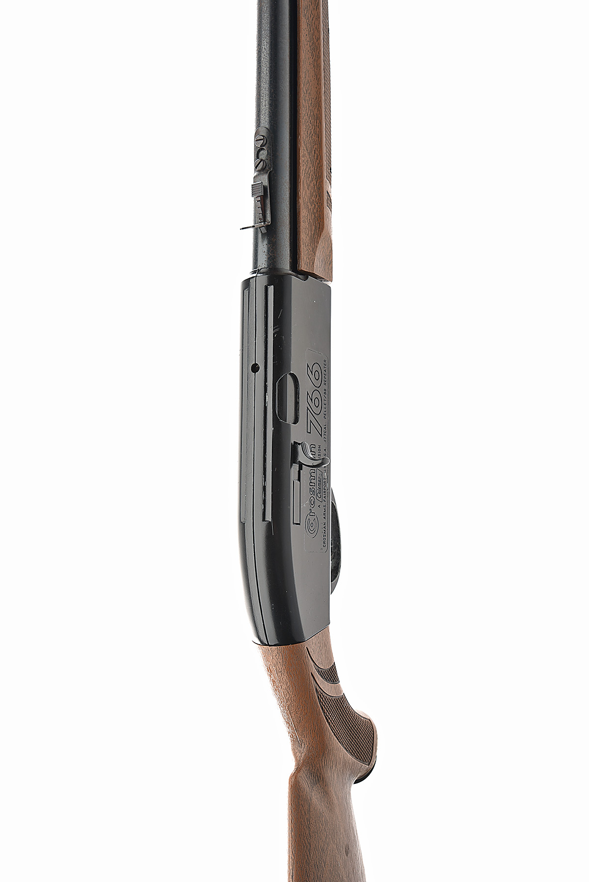 A BB/177 PUMP PNEUMATIC AIR RIFLE SIGNED CROSMAN MOD 766 Serial no 379011393 with a 21in. barrel, open sights, dovetail grooved receiver for fitment of a telescopic sight, two piece beech stock. Not tested.