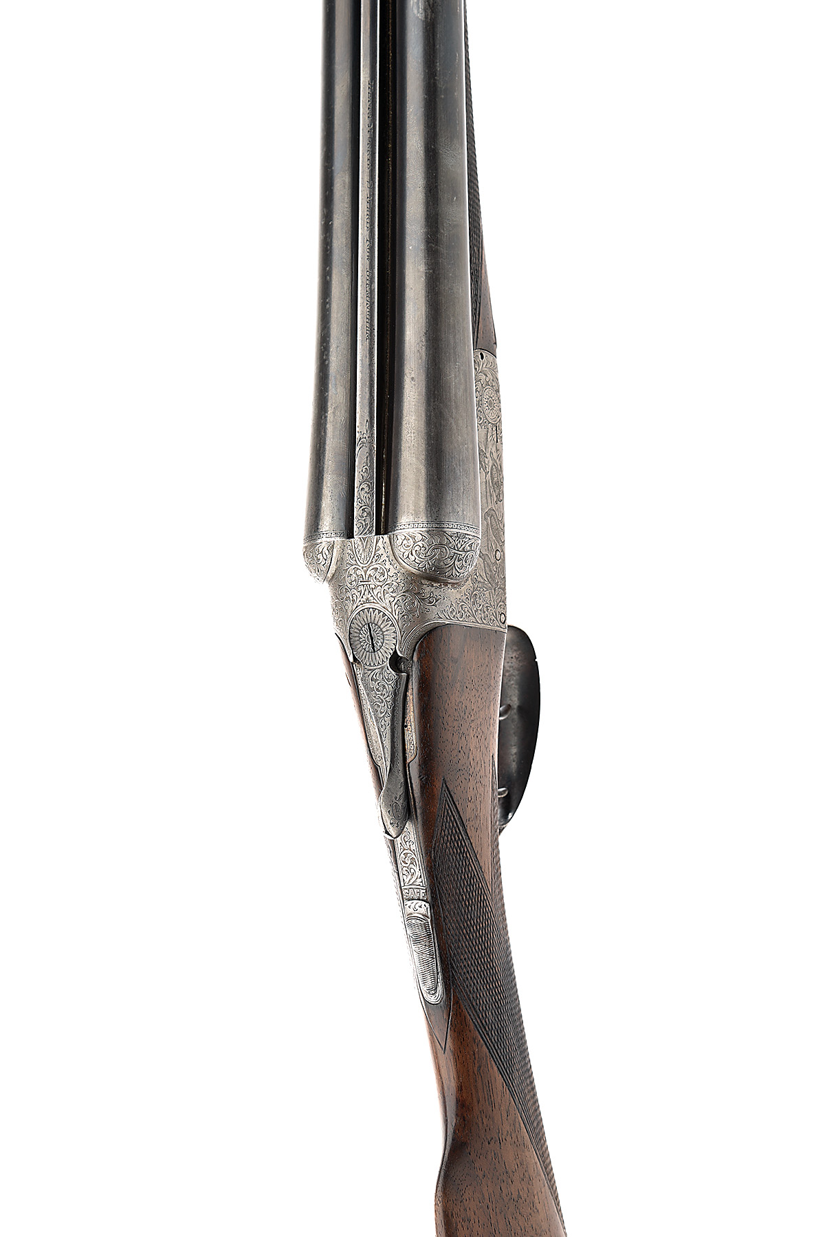 HENRY MORRIS 12-BORE BOXLOCK EJECTOR, serial no. 2120, circa 1945, 28in. nitro barrels (pitted, walls below recommended minimum), rib engraved 'HENRY MORRIS. ST. MARY'S ROW. BIRMINGHAM.', 2 3/4in. chambers, bored approx. true cyl. and 3/4 choke, automatic safety, border and acanthus scroll engraving surrounding game scene vignettes, 14 1/2in. stock, weight 6lb. 6oz.