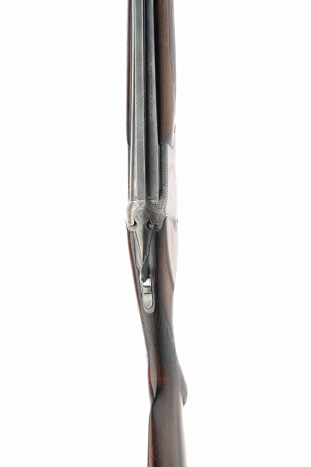 FABRIQUE NATIONALE 12-BORE DOUBLE-TRIGGER OVER AND UNDER EJECTOR, serial no. 64711, dated 1958, 28in. nitro barrels with 8mm ventilated matt top-rib, 2 3/4in. chambers, bored approx. 1/2 and 3/4 choke, hold-open toplever, manual safety with integral barrel selector switch, border engraving, 14 1/4in. semi-pistolgrip stock including buttplate, weight 7lb. 9oz.