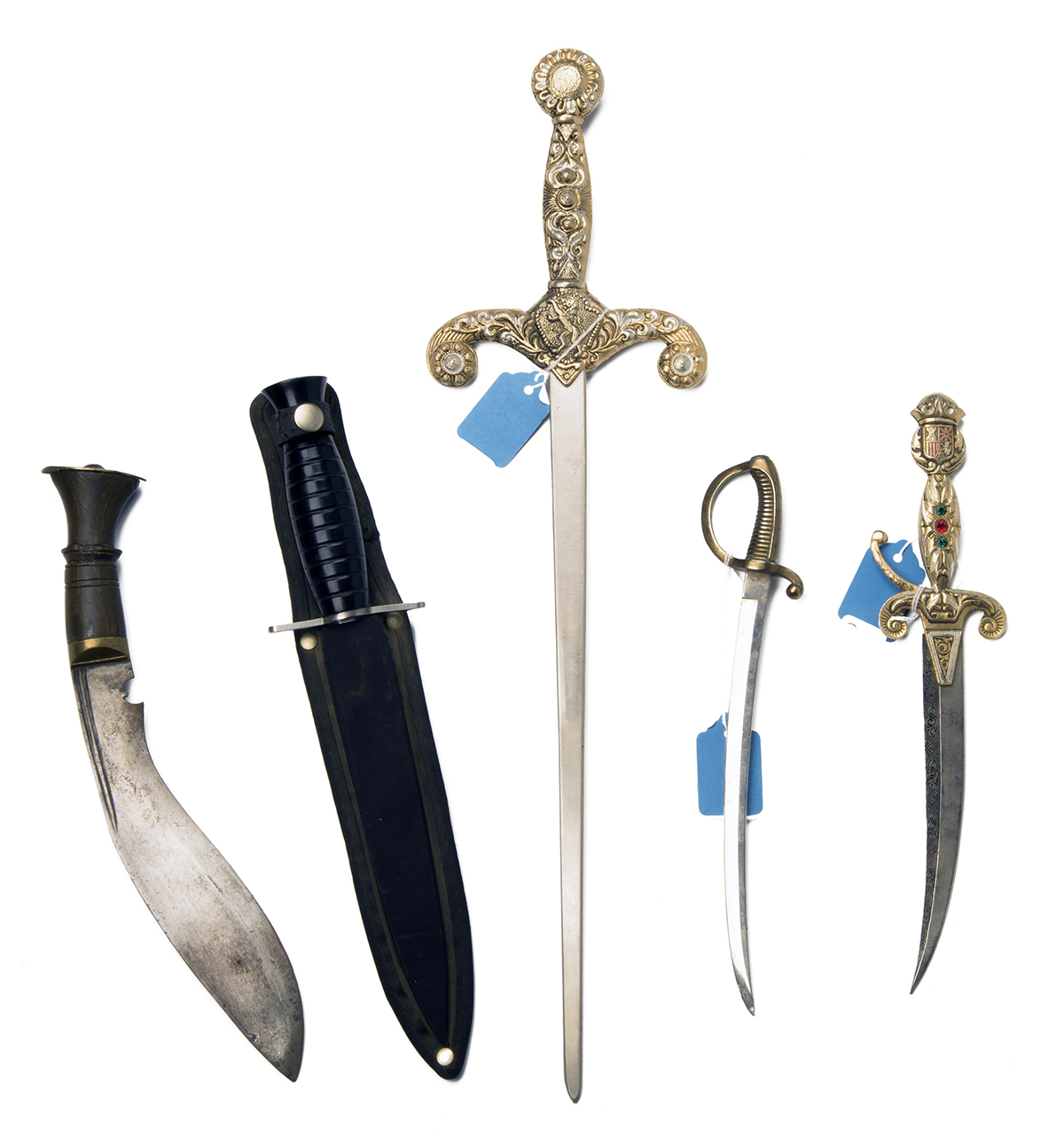 A MIXED GROUP OF 8 REPRODUCTION / FANTASY ITEMS, being 1) a fantasy short sword with 12 in. cast steel blade without cutting edges decorated to the front, cast decorative aluminium cross-guard and hilt with inset imitation plastic jewels, 18 in. overall; 2) fantasy dagger with decorative 6 in. curved sheet-steel blade without cutting edges, cast decorative aluminium cross-guard and hilt with inset imitation plastic jewels, 10 in, overall; 3) a tourist kukri with 8 in. blade of typical form, wooden hilt with brass fittings, blade with some surface rust, hilt chipped, damage to pommel, 11 in. overall; 4) a brass and steel letter-opener in the shape of a sword, 9 1/2 in. overall; 5) a fantasy short sword with 13 1/2 in. double-edged steel blade, rough cast steel hilt with a bronze coloured terminal to the blade tang, 18 1/2 in. overall; 6) a reproduction Roman gladius style short sword with a double-edged 11 in. steel blade, hilt with brass fittings, varnished wooden grip, 17 1/2 in. overall; 7) a Fairburn Sykes style fighting knife by Tramontina of Brazil with 7 in. stainless steel double-edged blade and cross-guard, plastic hilt in its plastic scabbard, 12 in. overall; 8) a reproduction two-ball flail-mace, with spiked cast steel balls attached by steel chain to a wooden shaft bound with a spiralled leather grip, shaft 17 in.