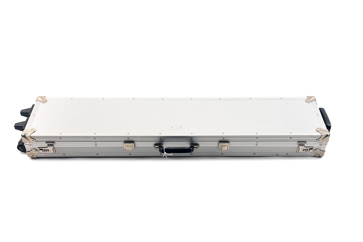A ALUMINIUM GUN CASE, 'A franzen aluminium gun case on wheels with internal measurements of 123cm(l) x 24cm(w) x 8cm (d including lid)'