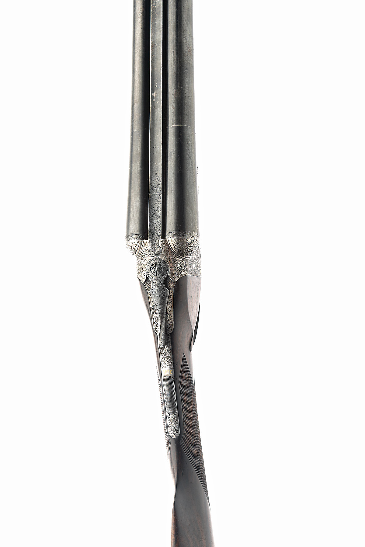 BEN EVANS & CO. LTD. 12-BORE BOXLOCK EJECTOR, serial no. 39561, circa 1900, 29 1/2in. sleeved steel to damascus nitro barrels (in 1970, rib loose), 2 1/2in. chambers, bored approx. 1/4 and 1/2 choke, treble-grip action, automatic safety with gold-inlaid 'SAFE' detail, border and acanthus scroll engraving, 15in. figured stock including 1in. wooden extension, weight 6lb. 9oz.