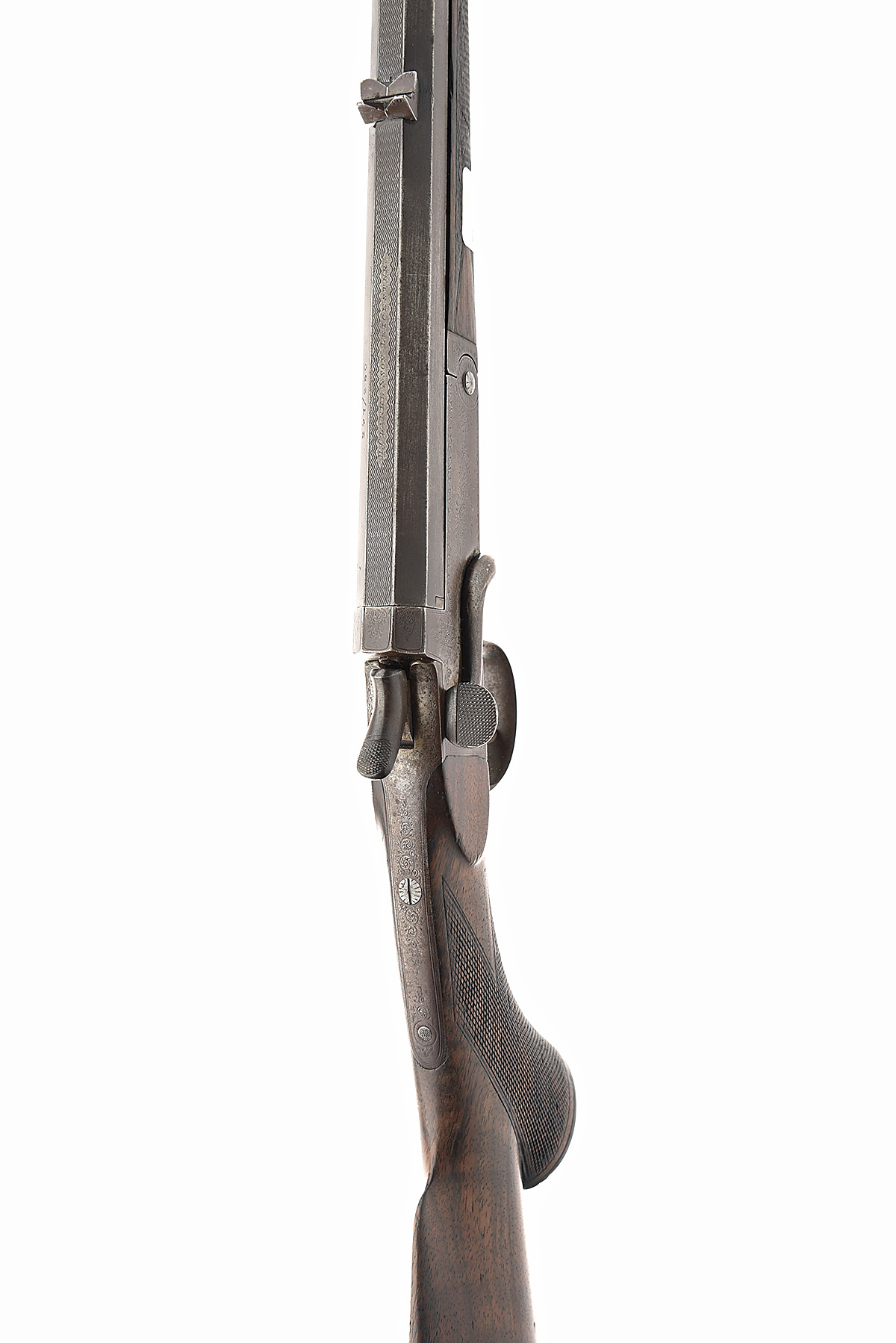 H. CLARKE & SON .297/250 SINGLE-BARRELLED SIDELEVER HAMMER ROOK & RABBIT RIFLE, no visible serial number, circa 1900, 26 3/4in. octagonal black powder only barrel with matted sight flat, engraved 'H. CLARKE & SON. LEICESTER.', dove-tailed bead fore-sight, standing notch rear sight with one folding leaf, marked for 50 and 100 yards and with white metal inlaid sight lines, sidelever opening, central rebounding hammer, border and partial acanthus scroll engraving, patinated finish, 14 1/4in. figured pistolgrip stock, horn pistolgrip cap, Hackett type snap-on splinter fore-end, weight 5lb.