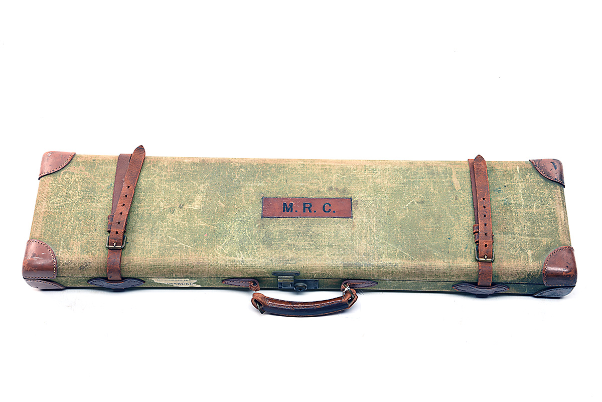 fitted for 28in. barrels, the interior lined with maroon baize, a Holland & Holland trade label, various cleaning heads, cleaning rod, brass lock (key missing), the lid exterior with 'M.R.C.', handle needs attention
