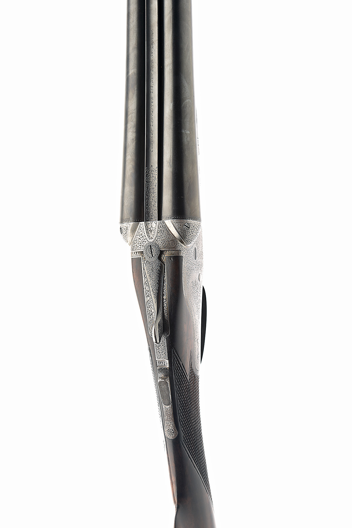 CHARLES LANCASTER 12-BORE ASSISTED-OPENING BACK-ACTION SIDELOCK NON-EJECTOR, serial no. 6665, circa 1891, 30in. replacement nitro barrels, rib engraved 'CHARLES LANCASTER 151, NEW BOND ST. LONDON.', 2 1/2in. chambers, bored approx. 1/4 and 3/4 choke, left wall at 19, Lancaster assisted-opening action, slender toplever, automatic safety with inlaid 'SAFE' detail, dipped-edge lockplates, fine border and acanthus scroll engraving, brushed and blued finish, 14 1/2in. figured stock including 5/8in. extension, weight 6lb. 7oz.