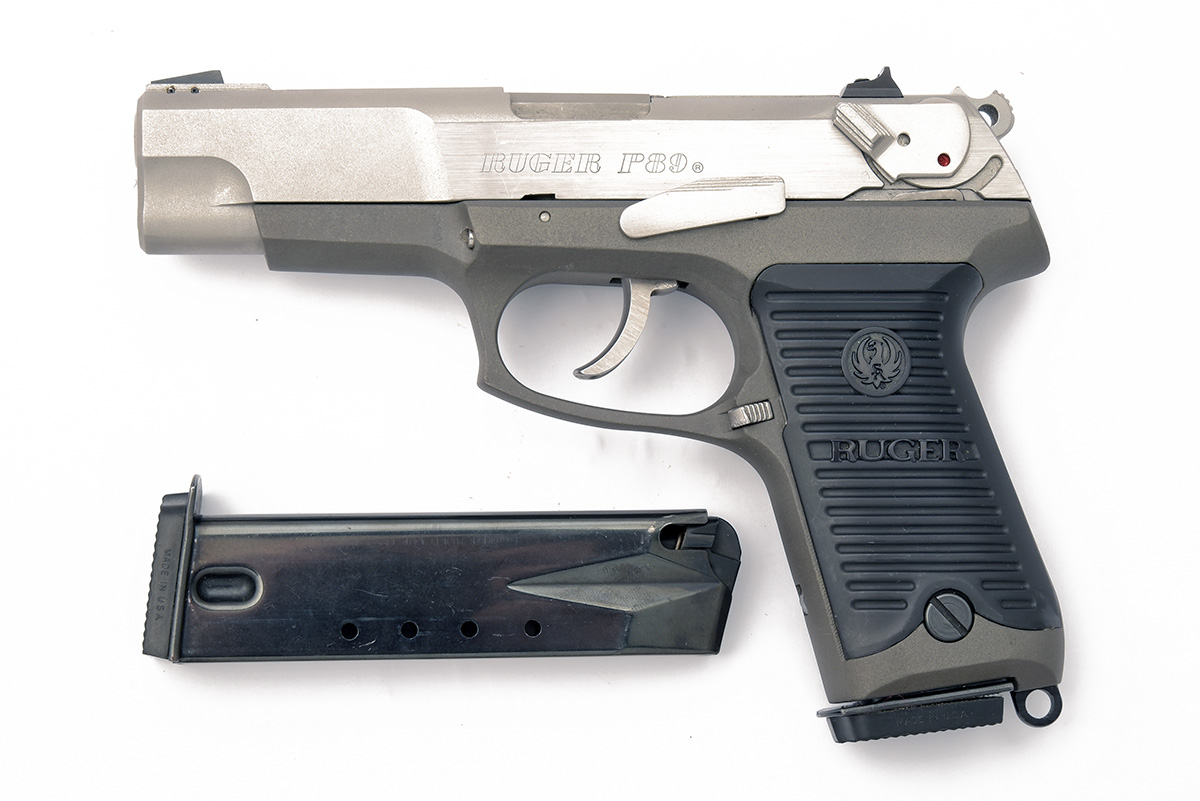 A BOXED 9mm (PARA) RUGER P89 SEMI-AUTOMATIC PISTOL, serial no. serial no. 304-22562 with stainless 4 1/2in. barrel, stainless slide, cast frame and black plastic grips, in its maker's abs plastic carton with spare magazine and loader