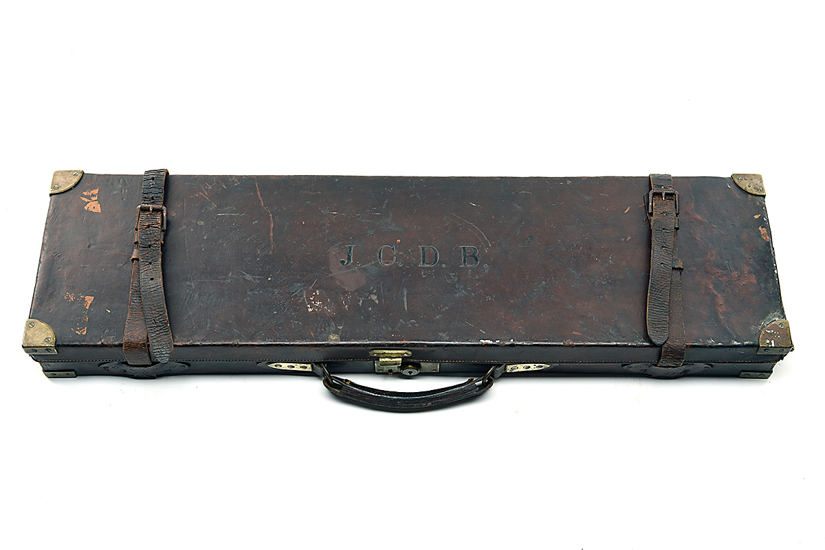 C.B. VAUGHAN BRASS-CORNERED OAK AND LEATHER SINGLE GUNCASE, fitted for 30in. barrels, the interior lined with green baize, a leather gold-tooled C.B. Vaughan trade label, brass lock (key missing), the lid exterior embossed with 'J.C.D.B.'