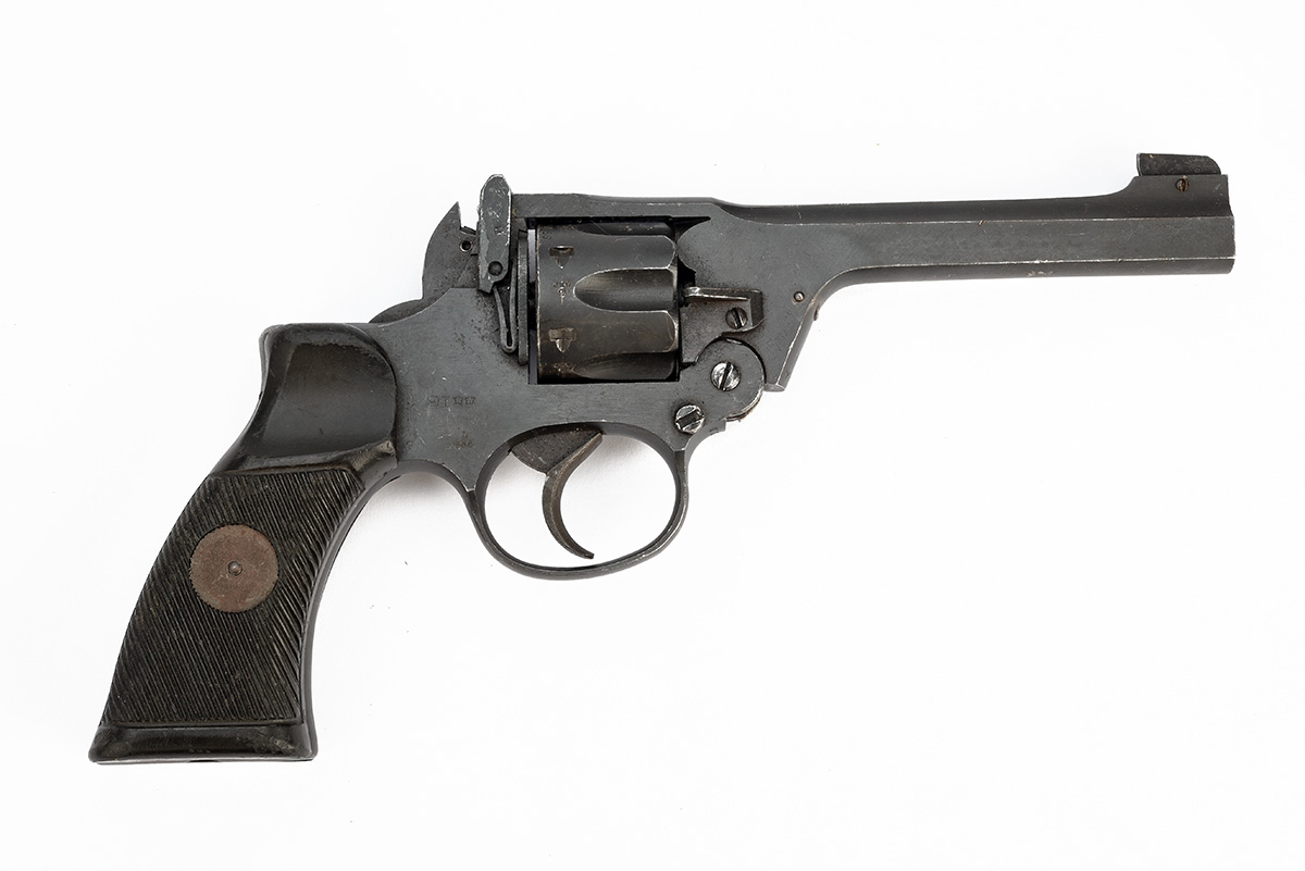 * A .38 (200) ALBION PRODUCED ENFIELD REVOLVER, serial no. Y3456, with 5in. barrel, 1943 date, bobbed hammer, break-open frame with auto-ejecting fluted cylinder and diagonally grooved black grips, much military finish