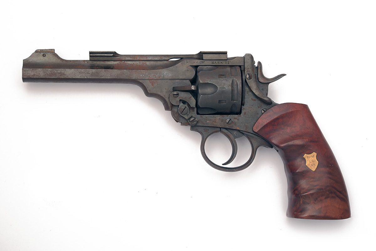 ** A .455 WEBLEY MKVI REVOLVER, serial no. 421438, dated for 1918, with 6in. barrel fitted with a telescopic sight mount-base, break-open frame with fluted cylinder and replacement smooth finger-grooved wood grips