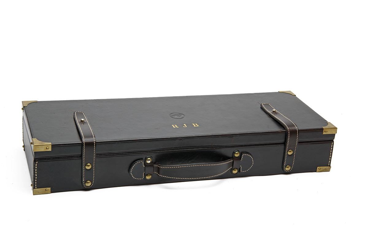 in a fitted brass-cornered leather case with blue baize-lined interior, the lid exterior with a central Willam Evans trade mark and embossed with the initials 'R.J.B.'