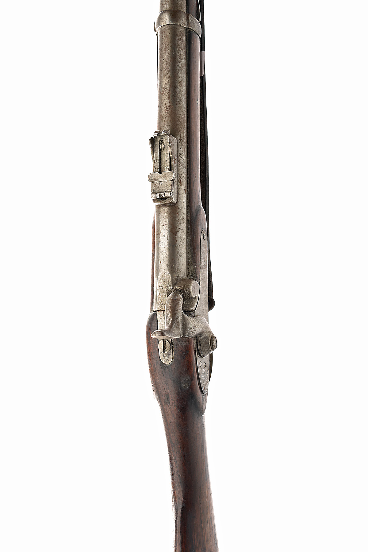 A .577 PATTERN 1853 SECOND MODEL PERCUSSION RIFLE, CIRCA 1857, SERIAL NO 520 with 39in. barrel having a blade and block front-sight and ladder rear-sight, the lock engraved with the Crown V.R. cypher on the tail and '185? / TOWER' to the centre, regulation brass mounted full walnut stock with three spring retained bands, complete with replacement rod and old brown leather sling, worn overall, probably a mutiny Enfield