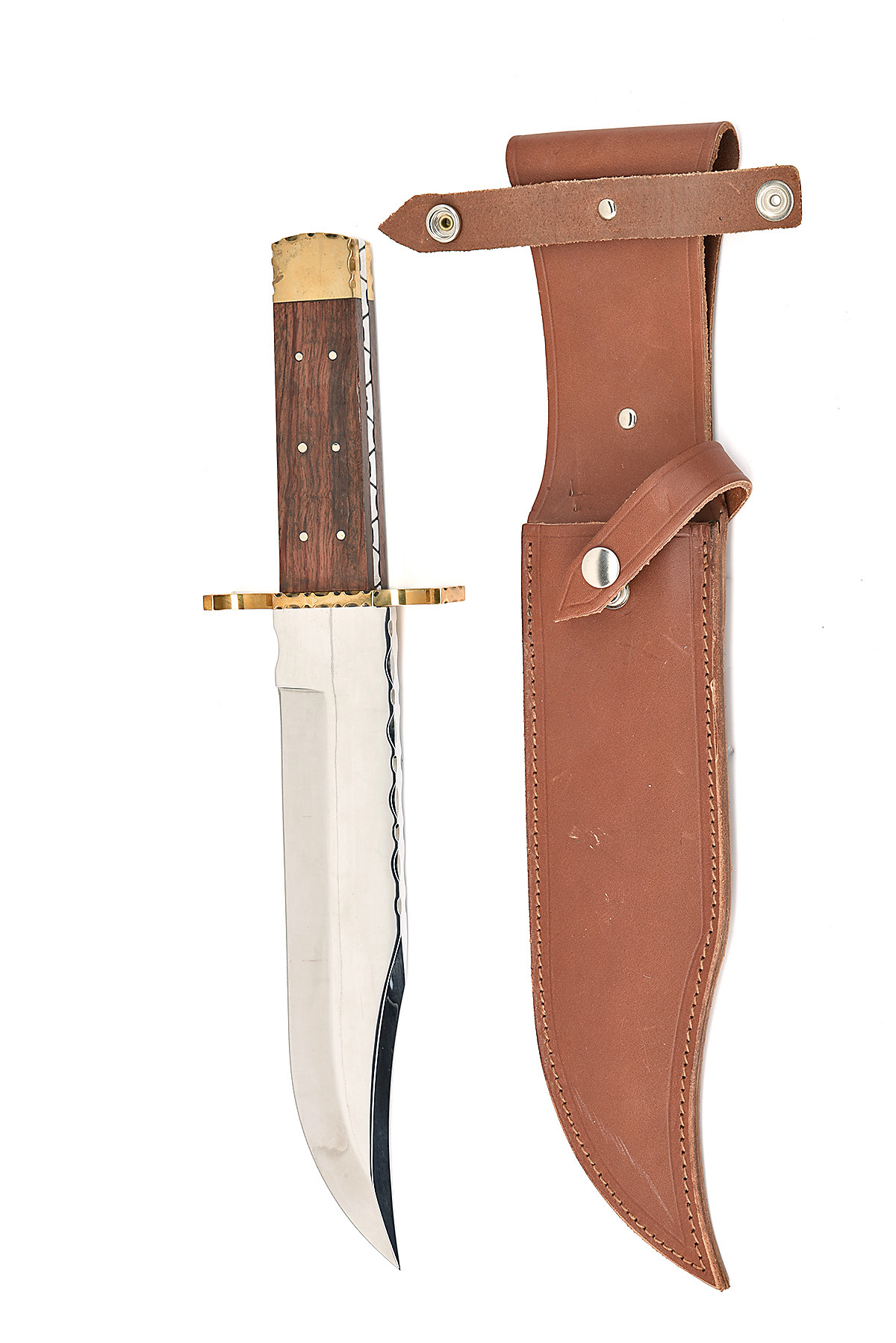 TWO LARGE HAND-CRAFTED ENGLISH BOWIE KNIVES, the first with 12 in. blade etched 'HAND MADE R. COOPER SHEFFIELD ENGLAND', heavy brass crossguard and staghorn grips, contained in its black leather scabbard, all as new and unused in original wrapping, the second with 10 in. blade etched with the American eagle over 'SHEFFIELD HANDMADE' and A. WRIGHT & SON LTD / SHEFFIELD ENGLAND', with its brown leather sheath, in unused condition