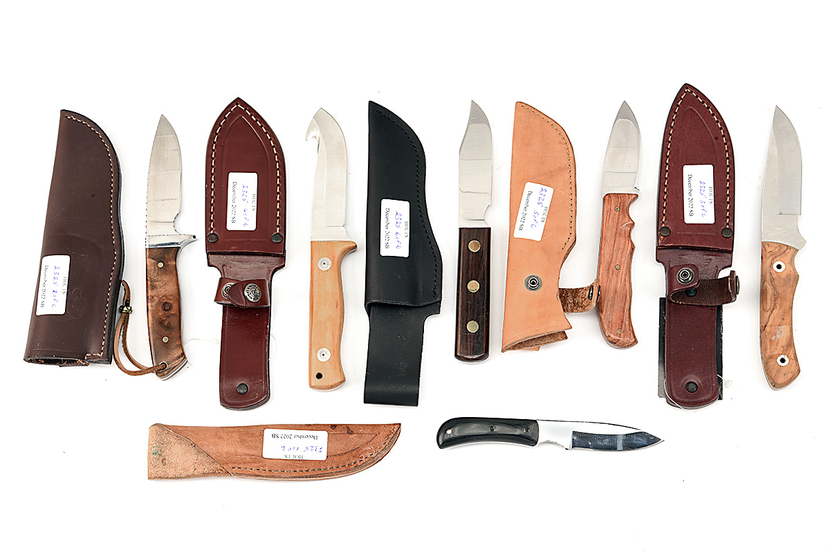 SIX ASSORTED SHEATH KNIVES, four with 4 in blades and two with 3 in blades by various makers, all with wooden grips, complete with leather scabbards, all as new
