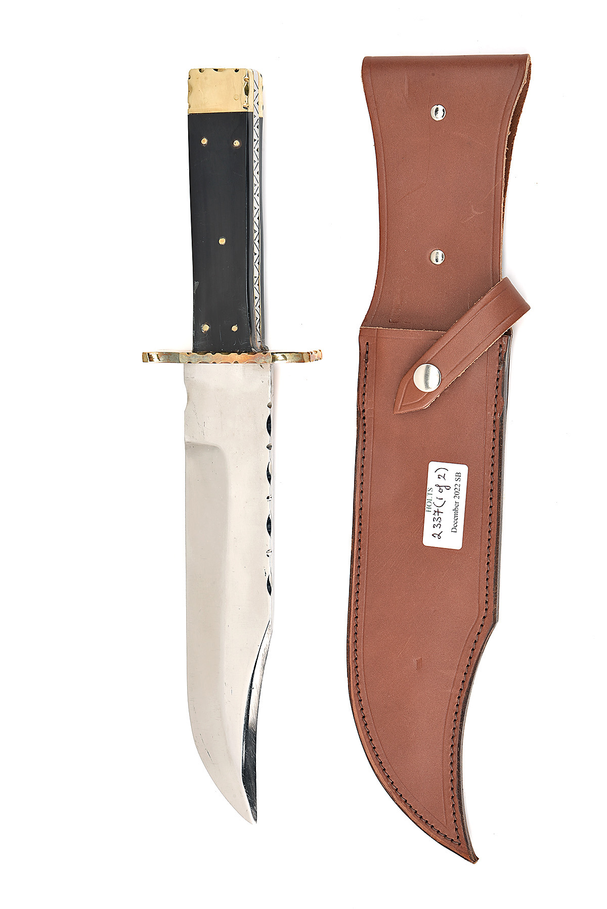 TWO IDENTICAL LARGE HAND CRAFTED ENGLISH BOWIE KNIVES BY R. COOPER both with wide 10 in clip pointed blades and etched 'HAND MADE R. COOPER, SHEFFIELD ENGLAND' both with two piece varnished brown leather grips, and brown leather sheaths the hilts with original wrapping and unused condition