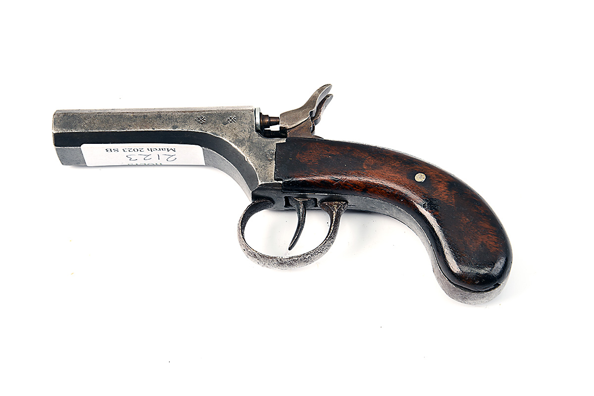 AN INTERESTING .36 DOUBLE BARRELLED PERCUSSION PISTOL, CIRCA 1850, no visible serial number,
