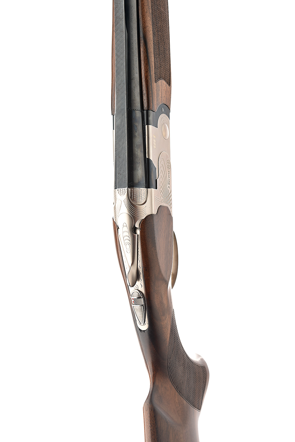 P BERETTA 12-BORE (3IN.) '686E' SINGLE-TRIGGER OVER AND UNDER EJECTOR, serial no. P04337B, dated 2002, 29 3/4in. nitro barrels with 9mm ventilated matt top-rib, 3in. chambers, multichokes (no spares), hold-open toplever, manual safety with integral barrel selector switch, gold-washed single trigger, satin finish with geometric designs, 14 1/2in. pistolgrip stock including buttplate, weight 8lb. 2oz.