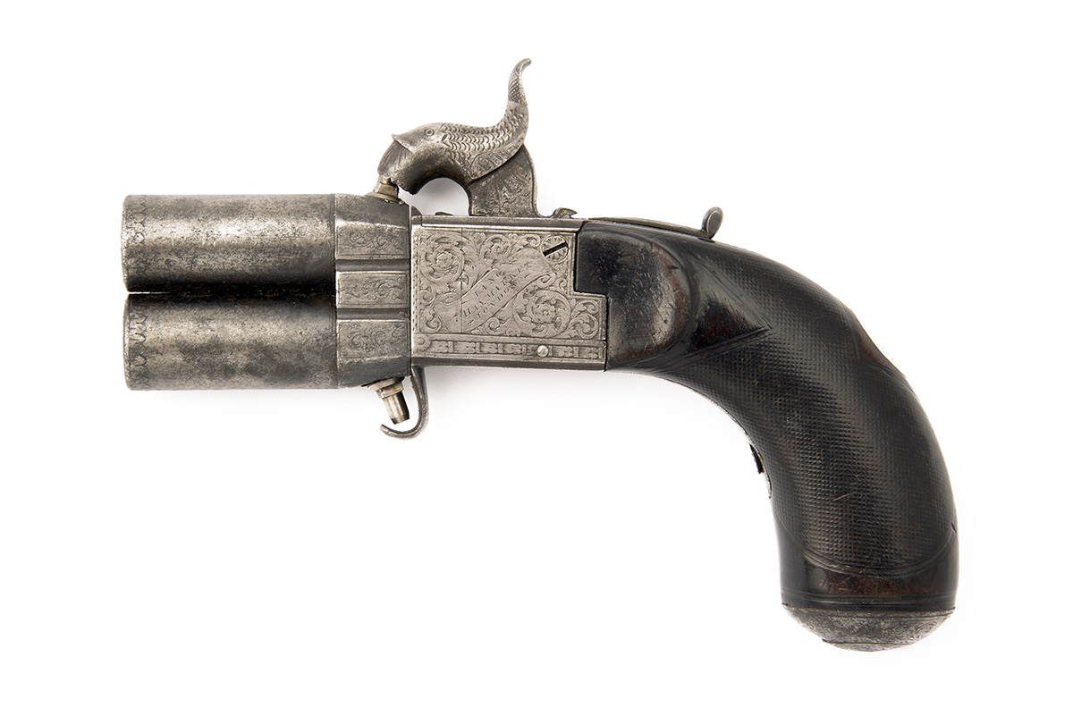 with 2in. turnoff barrels with muzzles deeply cut for key, foliate engraved barrel breeches (worn), profusely engraved boxlock action, the left-side engraved with the makers name 'LANG / 7 HAYMARKET / LONDON', centre hammer, with sliding catch safety and folding trigger, one piece chequered walnut bag shaped grip with inset silver escutcheon engraved with the original owners crest of an arm embowed in armour holding a dagger, over the initials 'R. A.', domed iron butt-cap incorporating a trap for percussion caps, the maker was Joseph Lang who was established at 7 Haymarket, 1825 to 1853