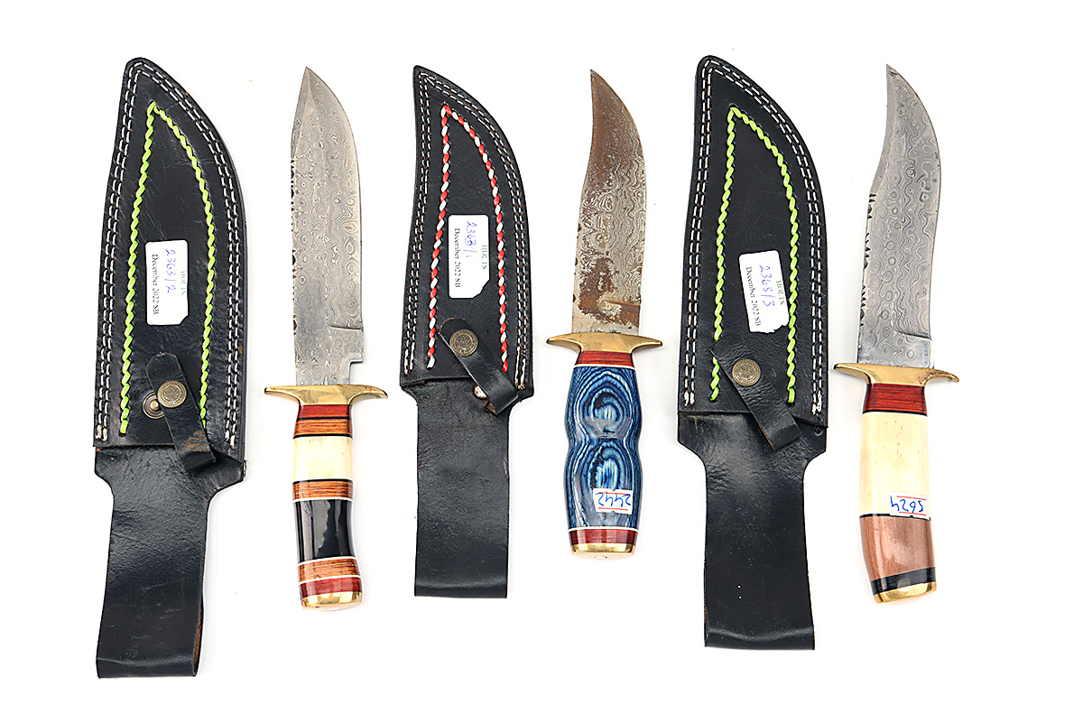 THREE SMALL BOWIE TYPE KNIVES WITH ROSE DAMASCUS BLADES, two with 7 in. blades with good damascus patterns, brass cross-guards with grips of mixed wood and bone, the third with 6in. blade with some patches of rusting and staining, brass cross-guard blue laminate wooden grips, all complete with decorated black leather sheaths