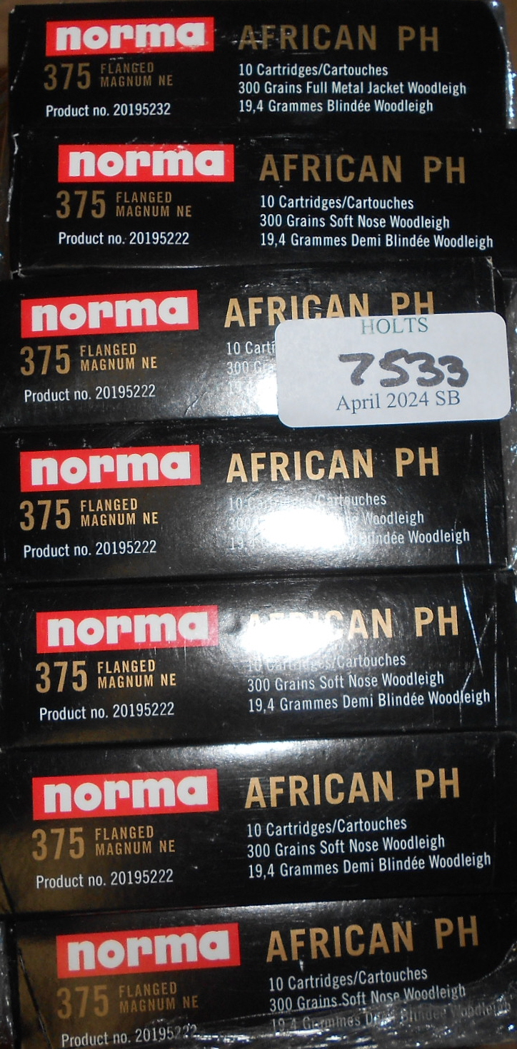 111 ROUNDS .375 H&H FLANGED AMMUNITION BY NORMA, 300 Grn. SOFT NOSE WOODLEIGH BULLET, AFRICAN PH, BATCH Please be advised that cartridges/ammunition, primers, primed cases, blanks and percussion caps CANNOT BE SENT ANYWHERE in the UK or EXPORTED OVERSEAS by POST or CARRIER. Due to this NATIONAL and INTERNATIONAL CARRIER rule, within 30 days of the sale date, please arrange collection with our shipping department from our Norfolk HQ. If payment and collection is not arranged within 30 days of the sale date, that will indicate that the items are not required and they will be disposed of.