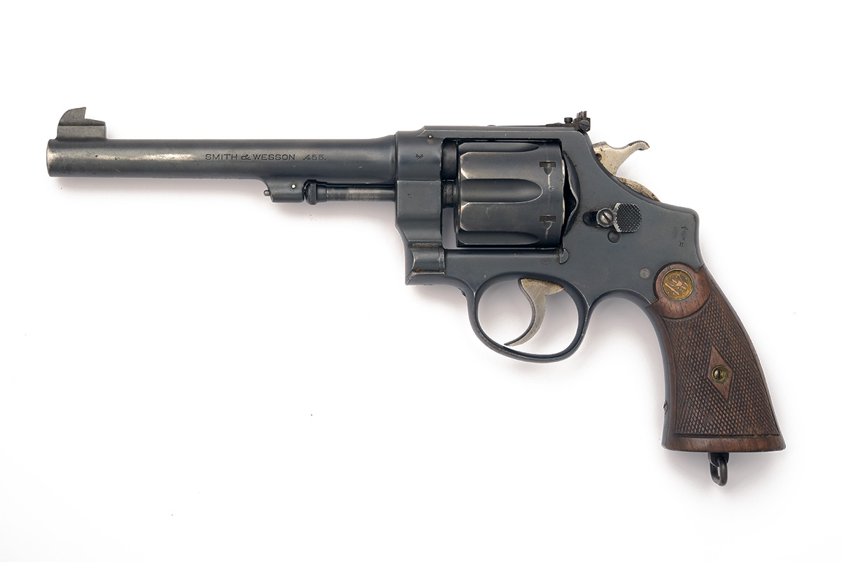 circa 1915 and originally .455, with refinished 6 1/2in. barrel, solid frame with swing-out fluted six-shot cylinder and chequered walnut grips