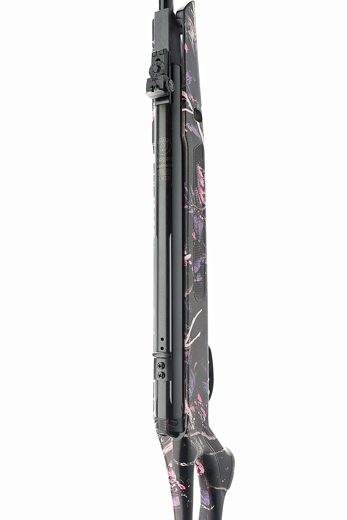 A BOXED .177 BREAK BARREL AIR RIFLE SIGNED HATSAN MODEL STRIKER EDGE MUDDY GIRL Serial 102010110 with an 18.5in. barrel, open sights, dovetail grooved receiver for fitment of a telescopic sight with a tang safety in a camouflage dipped synthetic stock. Appears unused