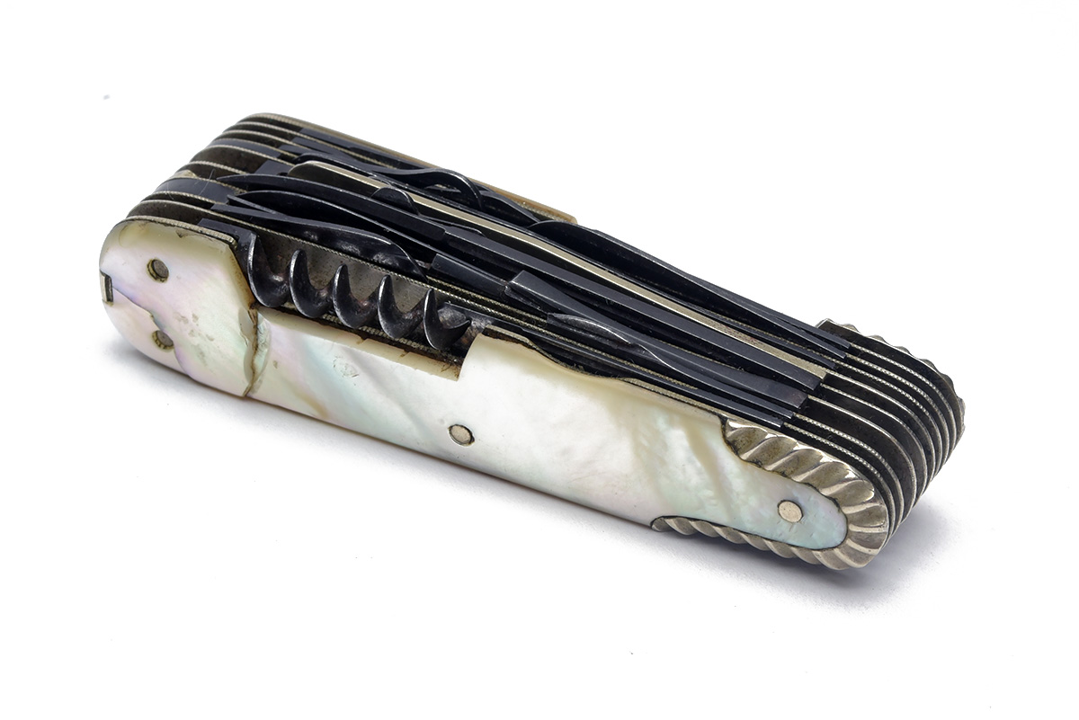 A VICTORIAN MOTHER-OF-PEARL POCKET MULTI-TOOL, circa 1890, mother-of-pearl grips and approx. 20 steel tools, one grip cracked, 3 1/4 in. closed