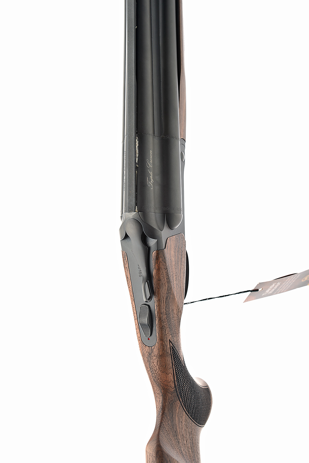 A VIRTUALLY NEW AND UNUSED AKKAR 12-BORE (3IN.) 'TRIPLE-CROWN' TRIPLE-BARRELLED SINGLE-TRIGGER TRIGGERPLATE-ACTION NON-EJECTOR, serial no. 1760016, circa 2014, 32in. superior proofed nitro barrels in pyramid configuration, with 6mm ventilated matt top-rib, 14 1/4in. figured pistolgrip stock including rubber recoil pad, beavertail fore-end, weight 9lb. 3oz., in its makers universal ABS case with paperwork and cardboard outer