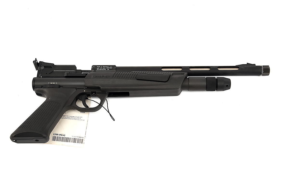 A BOXED UMAREX RP5 .177 CO2-POWERED AIR PISTOL, serial no. RPG18402549, with 12 1/2in. barrel threaded for a moderator, pump-action cocking, black polymer grips and fore-end and black finish, appearing unused in its maker's card and polystyrene carton (untested)