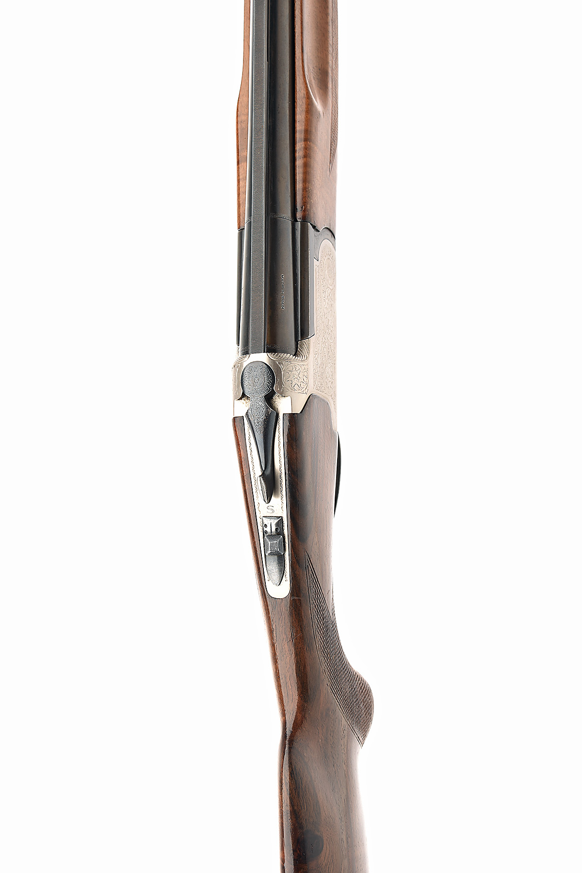 LANBER 12-BORE (3IN.) SINGLE-TRIGGER OVER AND UNDER NON-EJECTOR, serial no. 186581, dated 1981, 25in. nitro barrels with 6mm ventilated matt top-rib, 3in. chambers, bored approx. imp cyl. in both, hold-open toplever, automatic safety with integral barrel selector switch, acanthus scroll engraving, 14 1/2in. pistolgrip stock including 5/8in. extension