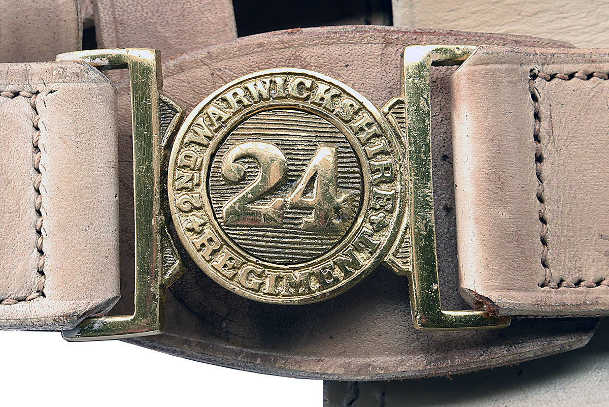 A REPRODUCTION SET OF PATTERN 1882 VALISE EQUIPMENT, comprising belt with buckle for the 2nd Warwickshire Regiment; cross-straps, x2 ammo pouches, additional pouch and bayonet frog, light wear only