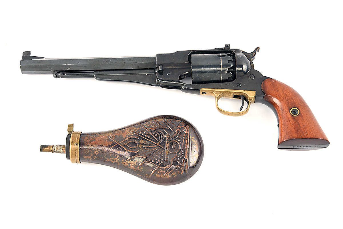 A BOXED REPRODUCTION PIETTA .44 PERCUSSION REMINGTON ARMY REVOLVER, serial no. 146669 with blued 8in. barrel, adjustable sights, plain cylinder, plain frame and smooth walnut grips, in its maker's card and polystyrene carton together with a reproduction powder flask