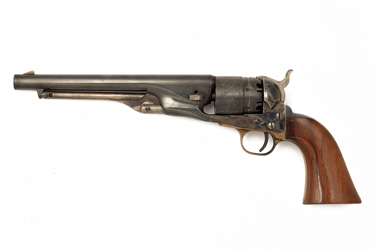 A REPRODUCTION  .44  PERCUSSION UBERTI COLT 1860 ARMY REVOLVER, serial no. 82813, with blued round 8in. barrel, stepped and engraved cylinder, open iron colour hardened frame with provision for shoulder stock (absent) and smooth walnut grip