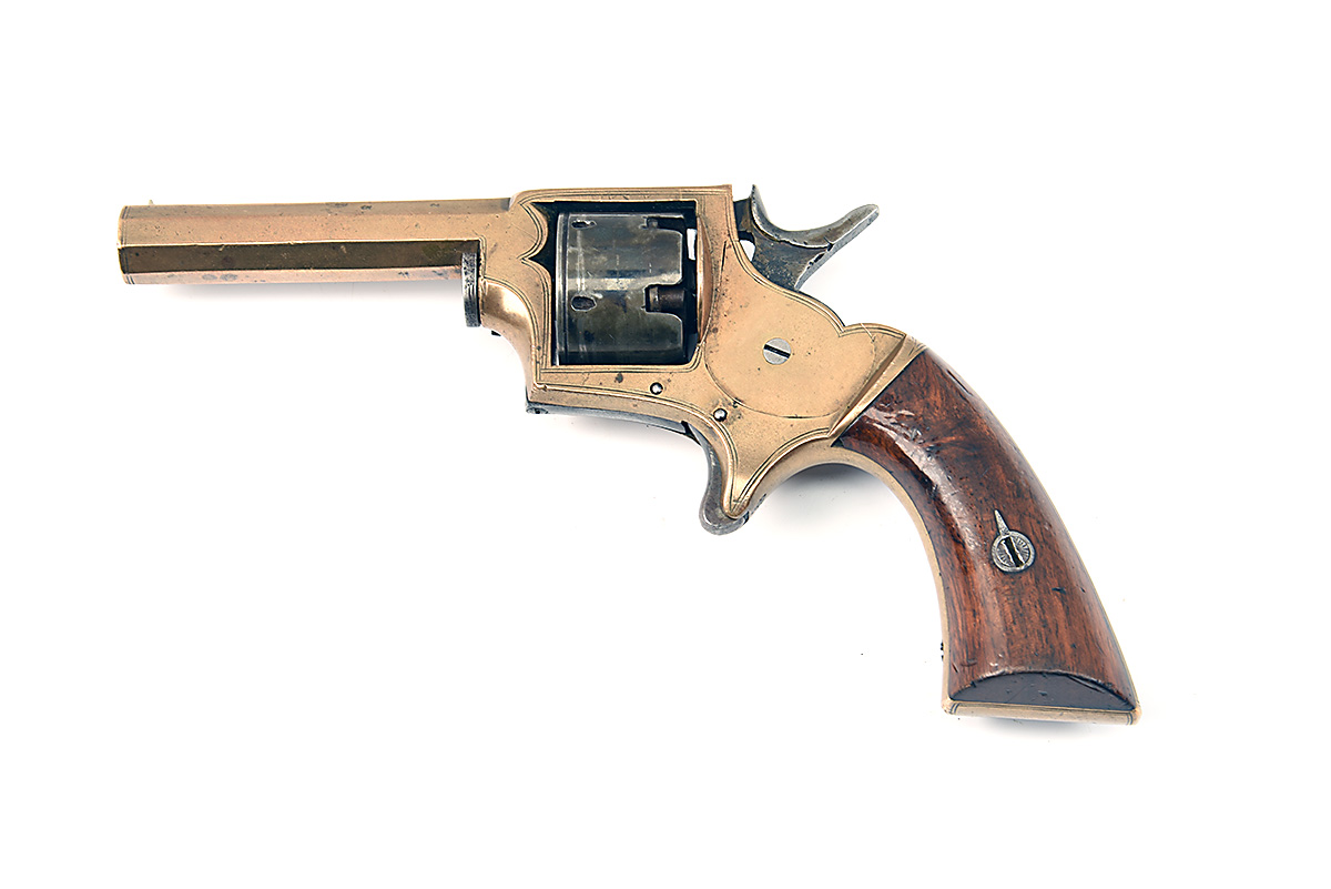 A .31 PERCUSSION BRASS-FRAMED POCKET-REVOLVER, UNSIGNED, serial no. 177, possibly originally supplied with an additional rimfire cylinder, with octagonal bras 2 7/8in. barrel, solid brass frame, iron cylinder with sunken nipples, spur trigger and smooth walnut grips