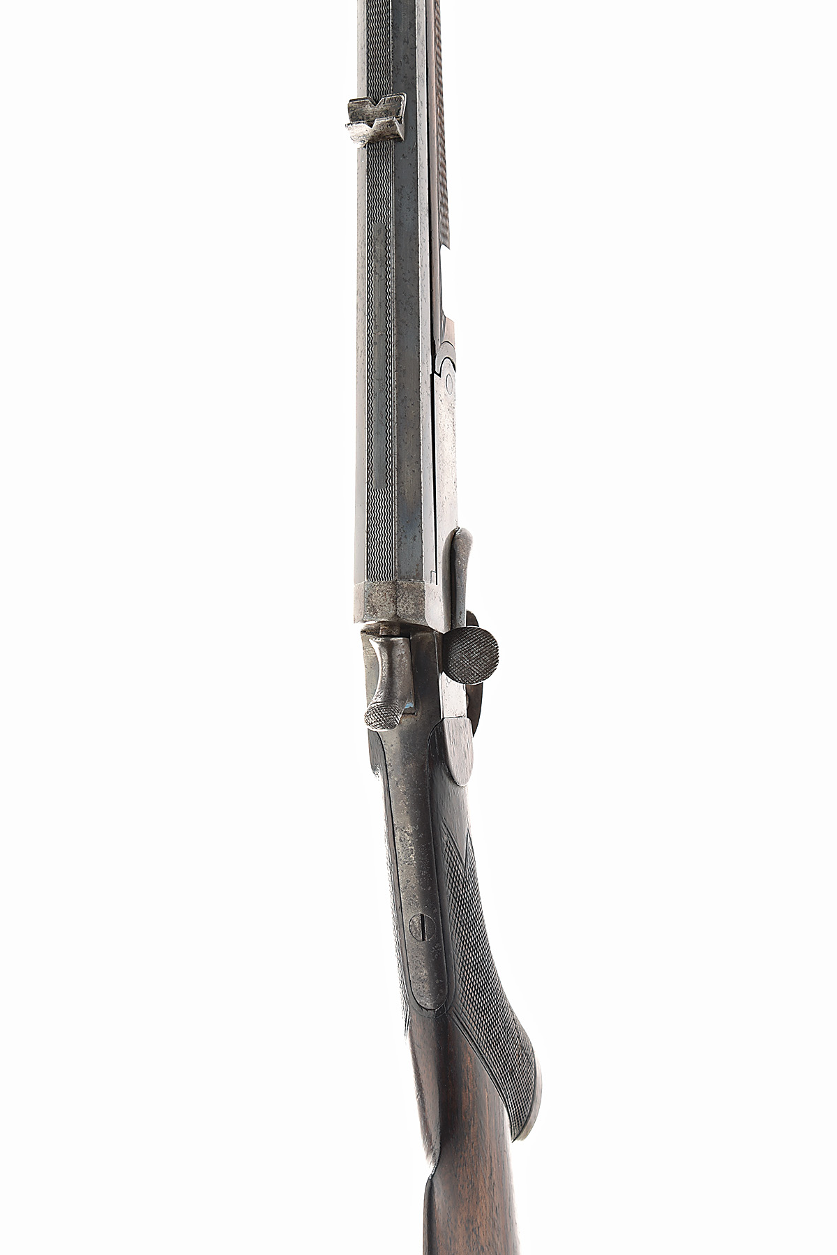 AN ENGLISH .300 (ROOK) SINGLE-BARRELLED SIDELEVER HAMMER ROOK & RABBIT RIFLE, no visible serial number, circa 1900, 27in. octagonal black powder only barrel with matted sight flat, dove-tailed bead fore-sight, standing notch rear sight with two folding leaf sights marked for 50, 100 and 150 yards, sidelever opening, central rebounding hammer, plain action retaining very slight traces of original colour-hardening and finish, 14 1/2in. pistolgrip stock